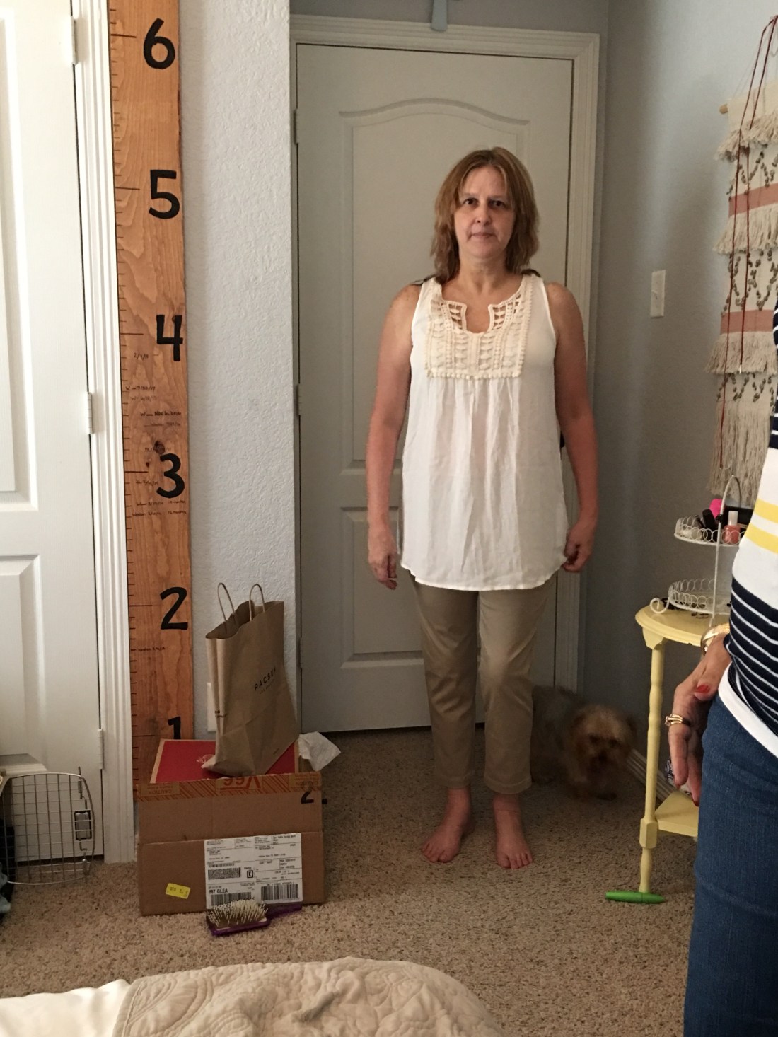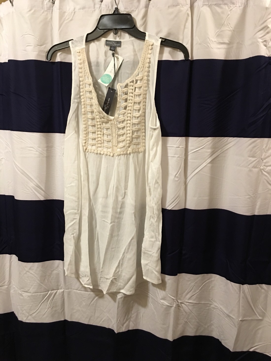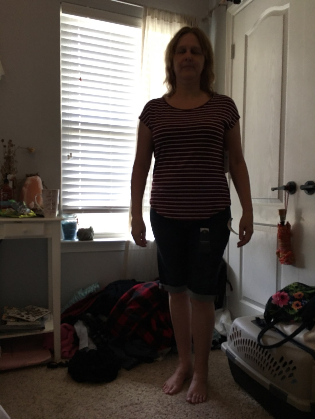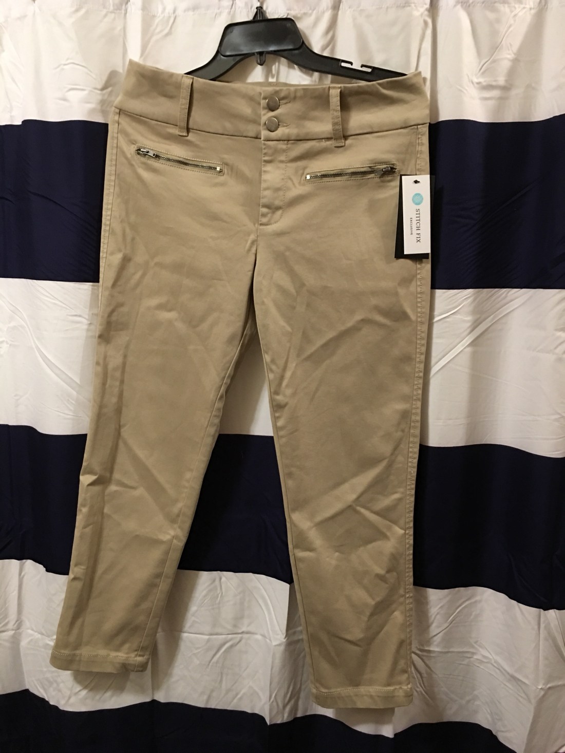 Earlier this month I received my second Stitch Fix box. The first box wasn’t that great and I only kept one item… a pair of jeans! The second box was so much better. I actually kept all five items! I can’t wait to get my next box! Please excuse the wrinkles in the new shower curtain and in the clothes. I should have taken them out of the box much sooner. I tried them on at my daughters house then put them back in the box to bring home. Pictures of me trying on the clothes were taken by my granddaughters in the bedroom of the oldest one!!!