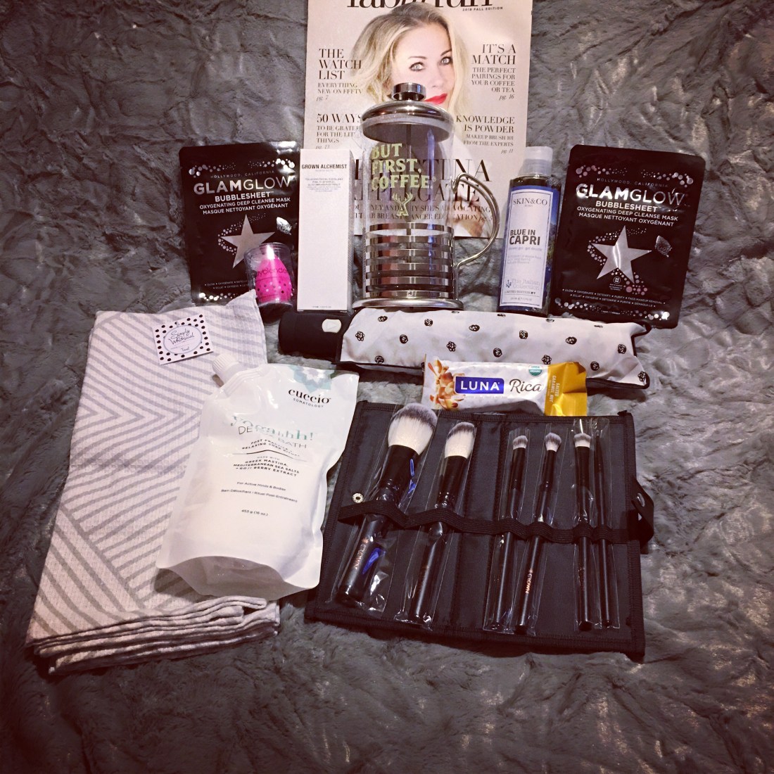 I was planning on purchasing a new BeautyBlender for my upcoming cruise but now I do not need to as there was one in my box!!!  Also in the box was Simply Whimsical Tea Towels, Skin&Co Roma Blue in Capri, GlamGlow Bubblesheet Oxygenating Deep Cleanse Mask, Luna Rica Bar, Crown Brush 6 piece brush set in Black + Rose Gold, Alfred French Press, Catherine Malandrino Umbrella in Black/White floral, Grown Alchemist Polishing Facial Exfoliant, and Cuccio Somatology Yogahhh! Detox Bath.    I will definitely be taking the BeautyBlender, GlamGlow Bubblesheet, Crown Brush set, and the Catherine Malandrine Umbrella on our cruise.
