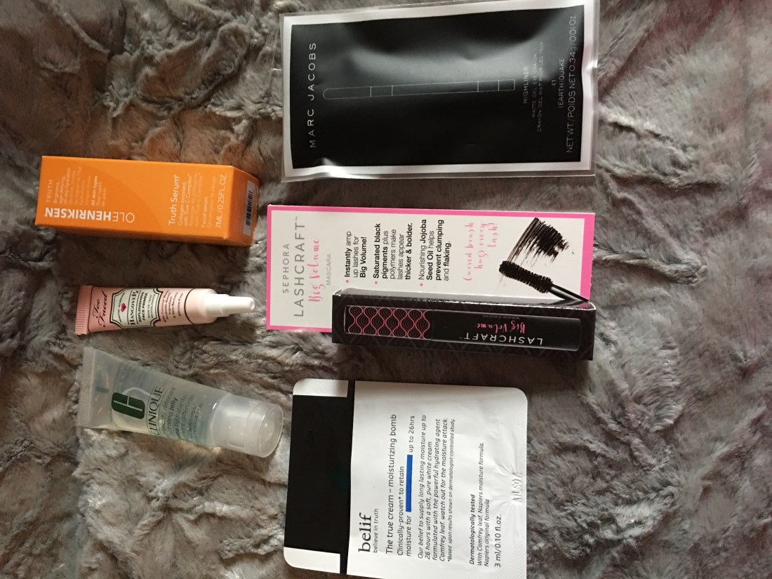 Now, let’s move on to the Sephora Play! box for September.  The price for this box is $10.00 plus shipping.  This box contained 6 sample size products.  The samples I received are Olehenricksen Truth Serum, Clinique Dramatically Different Hydrating Jelly, Too Faced Hangover Replenshing Face Primer, Marc Jacobs Beauty Highliner Matte Gel Eye Crayon Eyeliner in (Earth)quake, Sephora Collection LashCraft Big Volume Mascara in Black, and Belif The True Cream Moisturizing Bomb.  I’m looking forward to trying these products before our cruise.  You never know if I will need to get some of these items, specifically the hydrating ones!  They will certainly come in handy!!!
