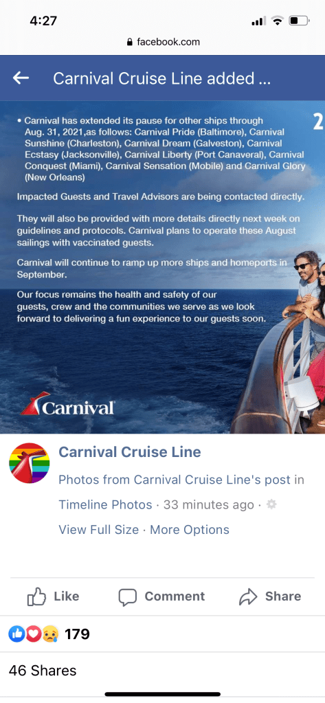 When we received notice that our cruise on the Carnival Dream was cancelled, I immediately contacted our super awesome PVP so see if there was any availability on the Vista leaving on 08/28/2021. Luckily, there were staterooms available so we are now book on the Carnival Vista. I’m so happy that our countdown has not changed.