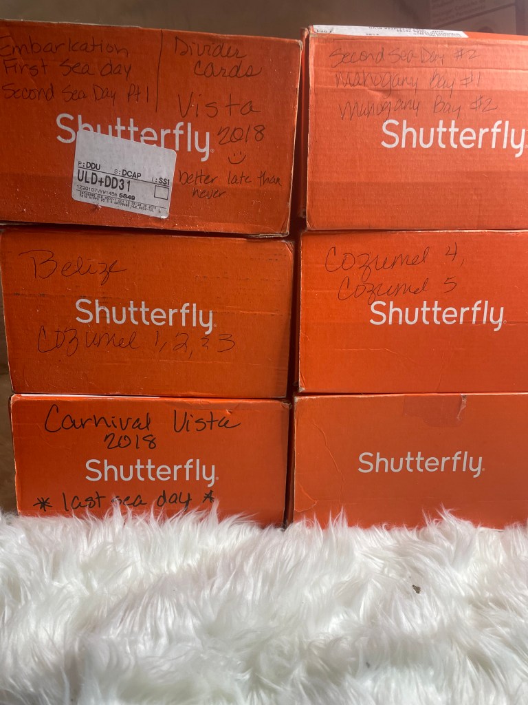 When I started this project, the photos were in the boxes we received them in from Shutterfly. I had already gone through all the photos to determine which area they should be in. And by area, I mean pre-cruise, travel day, embarkation day, and so on. This was a good start, but, obviously, still had a long way to go.