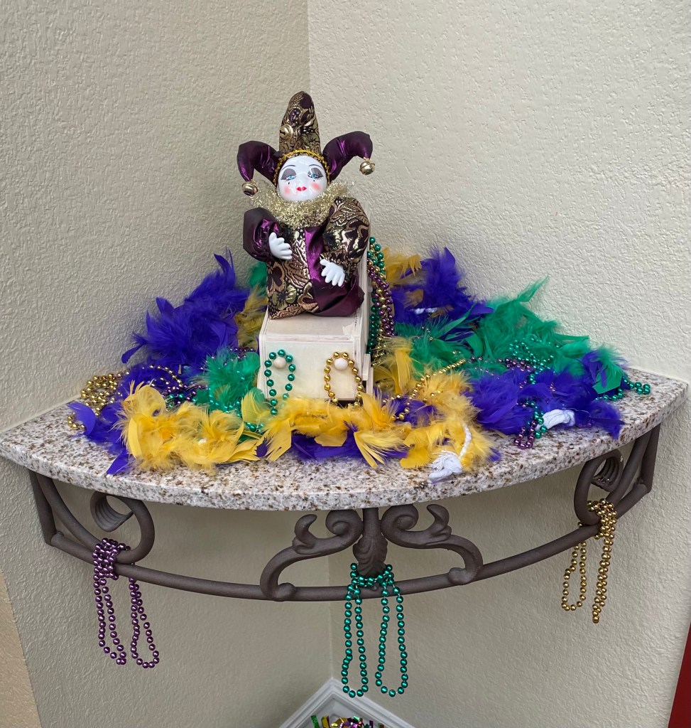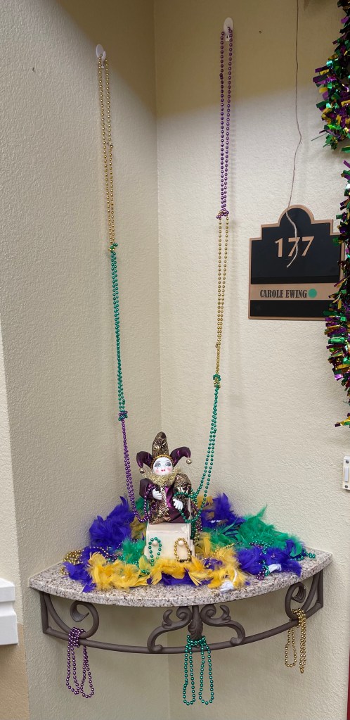 With Valentine’s Day over, it was time to decorate my mom’s door for Mardi Gras!!!! Everything fell into place real well, but after seeing how the wreath looks, I may do something different for next year with much brighter colors!!!! In any case, she is thrilled with the way her door looks and LOVES how Jim decorated her walker!!!!