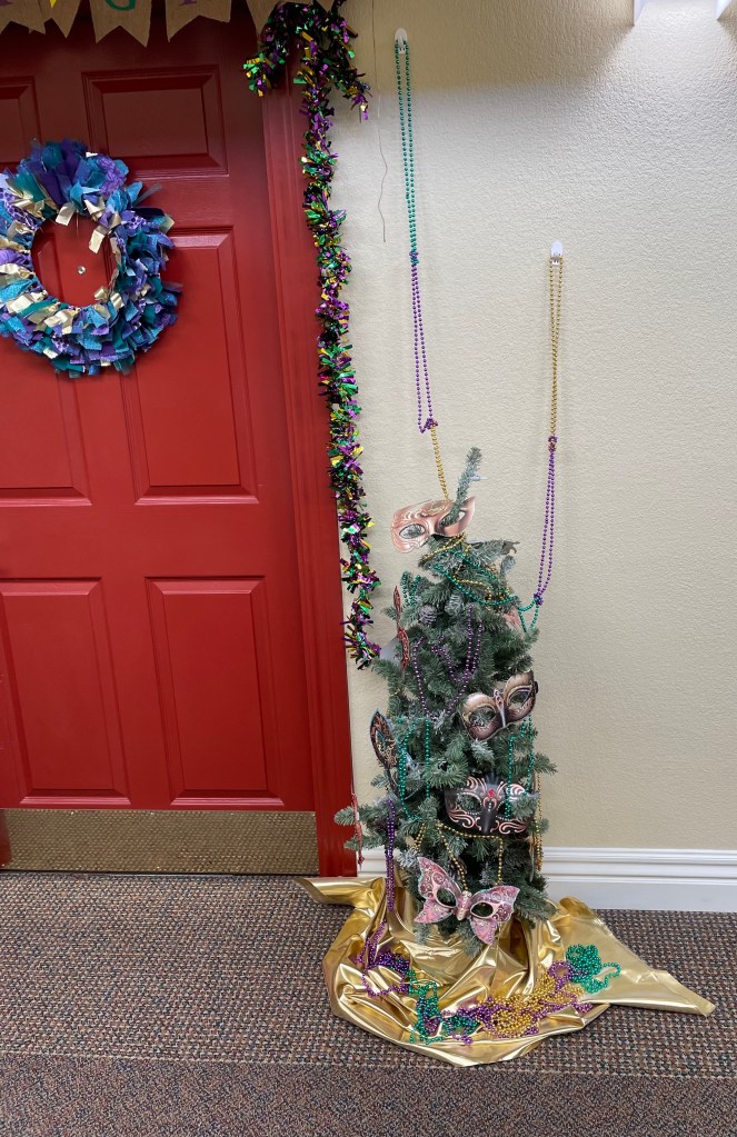 And, of course, Mardi Gras beads. I will be using them on the tree, with the garland around the door, and even on her walker!!!!