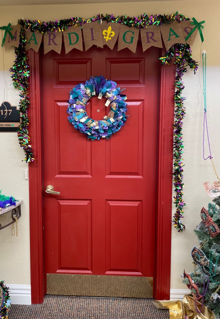 Decorating moms door for Mardi Gras!
