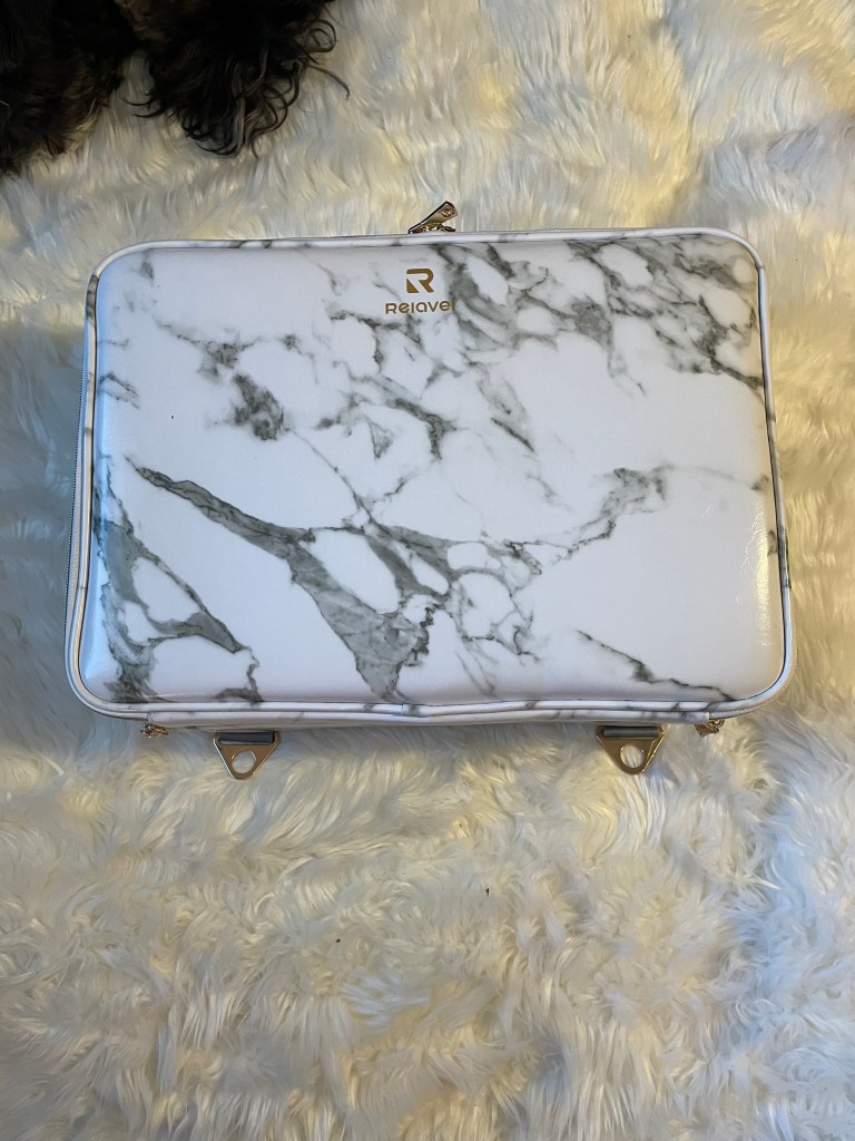 Relavel marble makeup bag, marble pattern. It measures at 10 1/2 ” wide x 6 1/4″ long x 3 3/4″ tall.