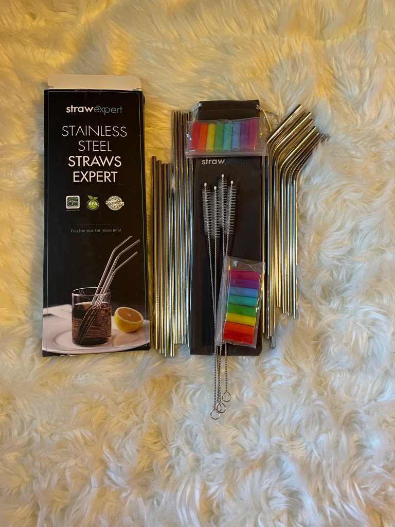 StrawExpert Set of 16 reusable stainless steel straws with travel case, cleaning brush, silicone tips, extra long metal straws for 20, 24, and 30 oz tumbler. Sold by StrawExpert.
