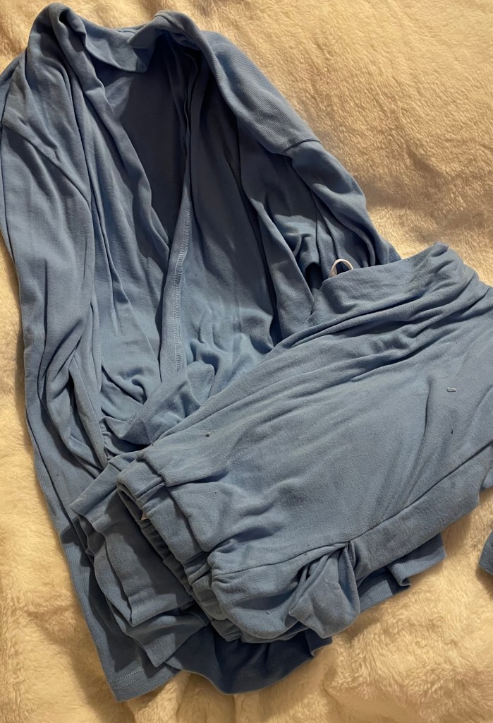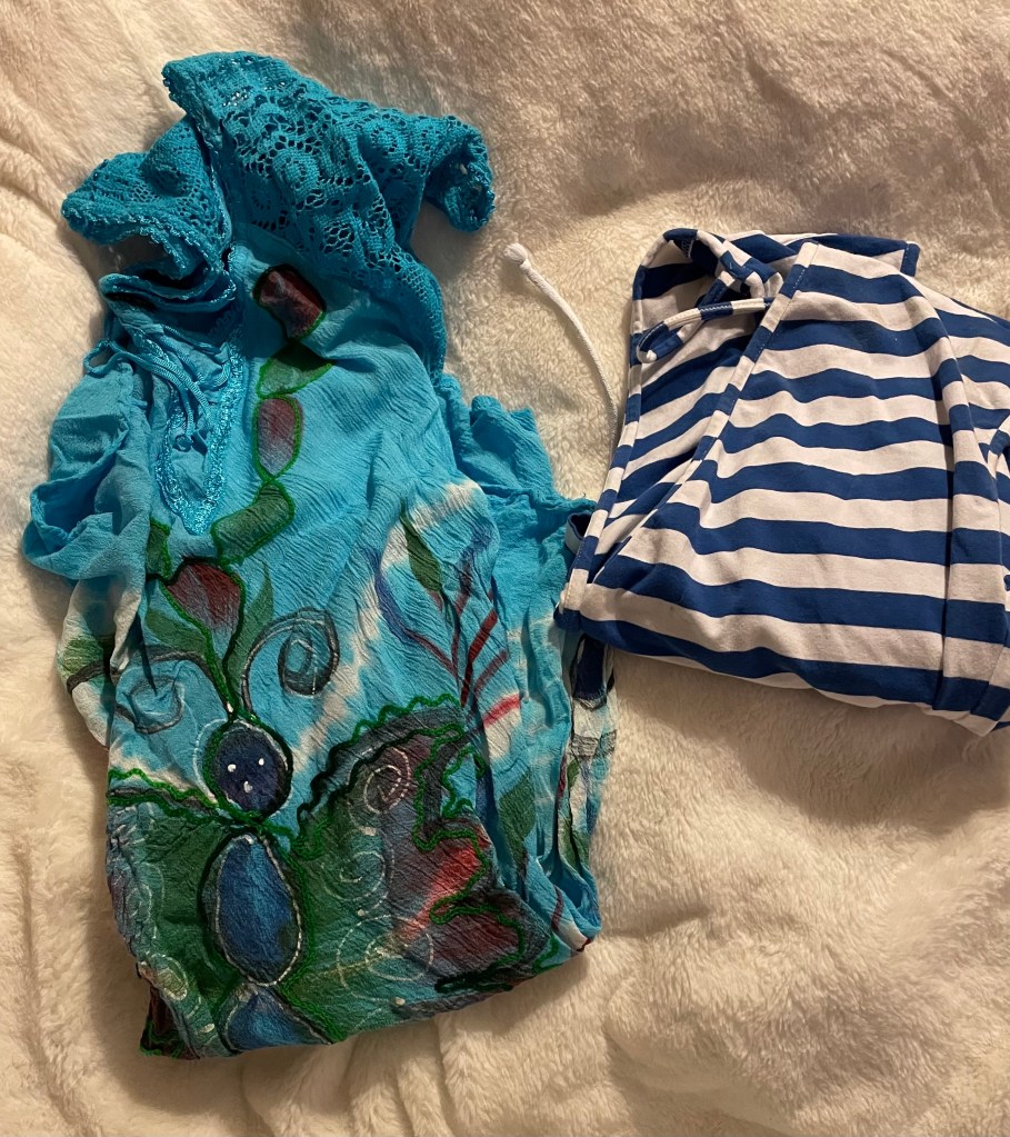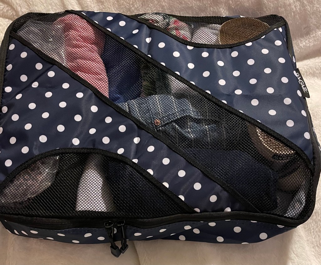 The items not shown above that I am taking are denim capri’s, black jeans, and a navy cardigan. They have been put in a packing bag and are ready to go.