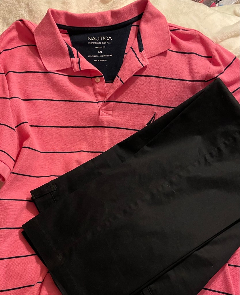 For our dinner in the steakhouse, I will be wearing a pink top, white pants/jeans, and pink and black heels. Jim will be wearing a pink with blue stripes Nautica golf shirt and navy pants. We are going to be casual, but not too casual.