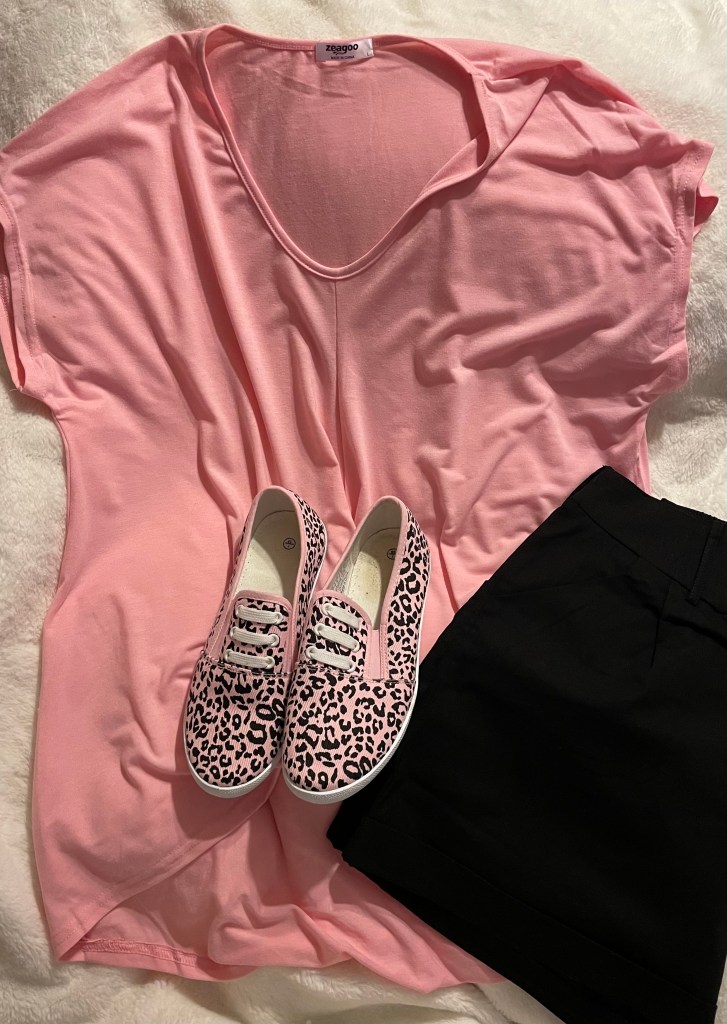 Sea Day #1 during the daytime I will be wearing a pink top and black shorts with pink and black leopard print shoes. Jim will be wearing his t-shirt of the day and shorts.