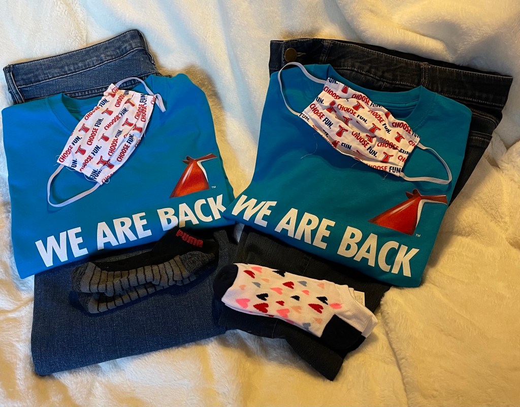 Embarkation day: t-shirt purchased on the Carnival Vista last year, jeans, Valentine socks, Reeboks. This was discussed in a previous blog.
