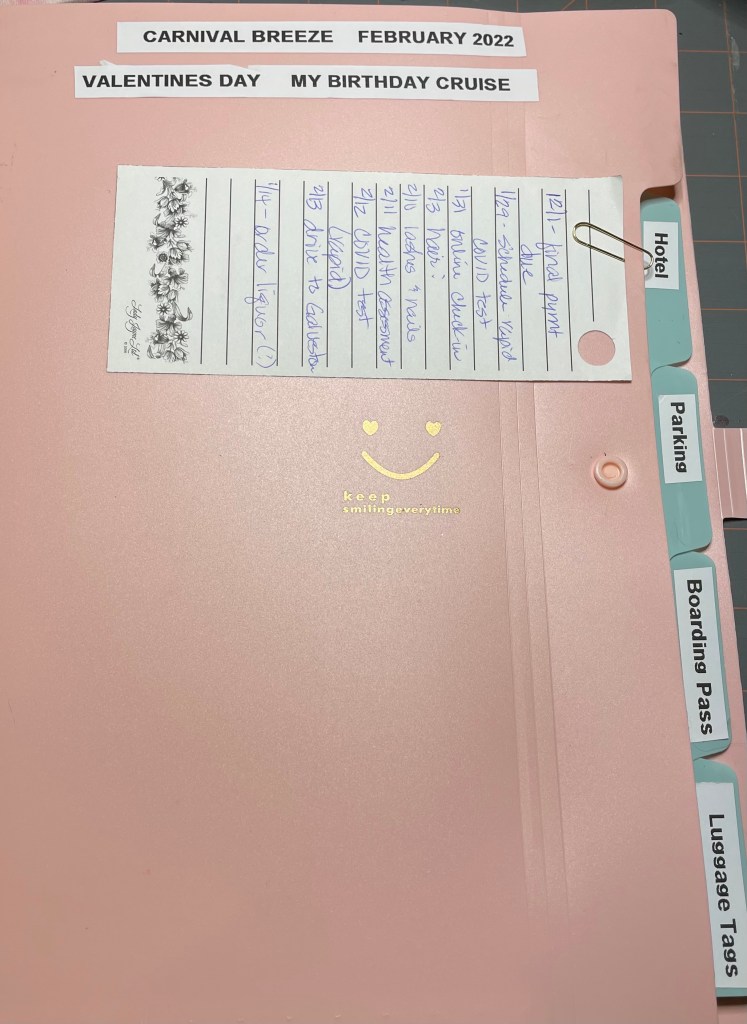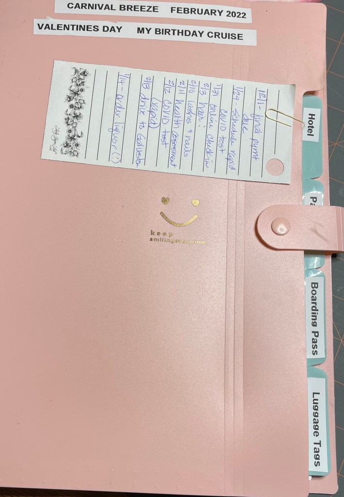 Then there is a folder that also has driving directions, hotel reservations, parking reservation, and boarding pass. Basically anything that I would need on travel day and embarkation day. If I can’t find something I think I need for the folder, there is likely a copy in the binder. I also have a reminder list paper clipped to the front just in case I forget something that is likely to be written down in one hundred other places!!!