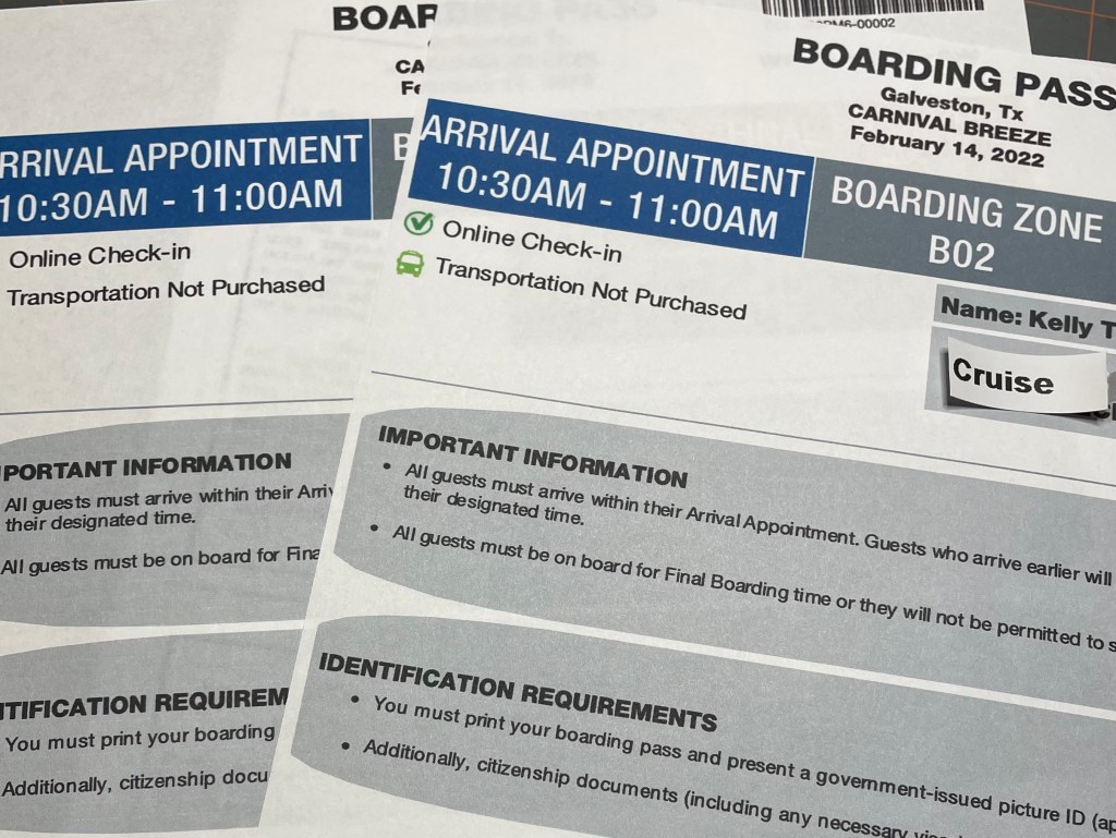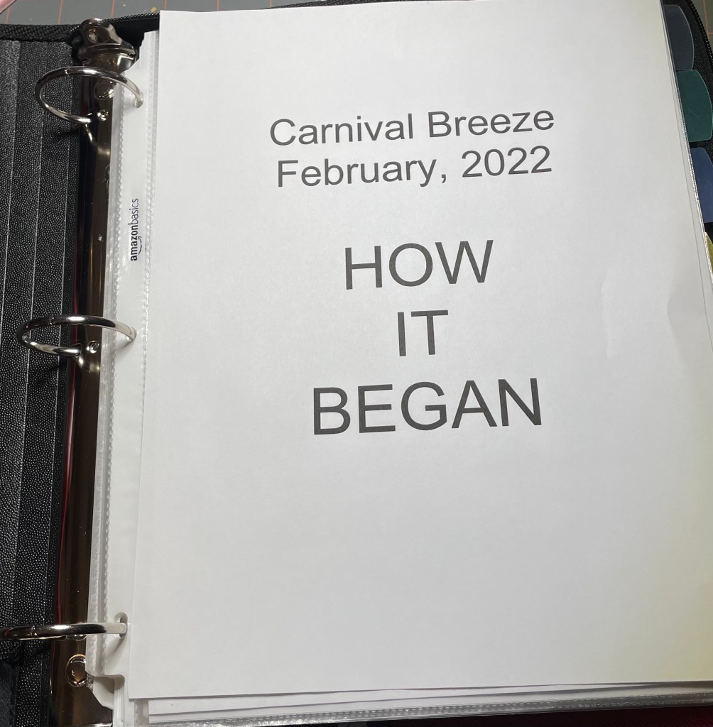 I use a zippered binder for copies of everything. And I do mean EVERYTHING. I have dividers in the binder for driving directions, hotel reservations, parking reservations, boarding pass, and everything else I have purchased or directly applies to this cruise. When we board the ship, the binder will be one of our carry-on bags.