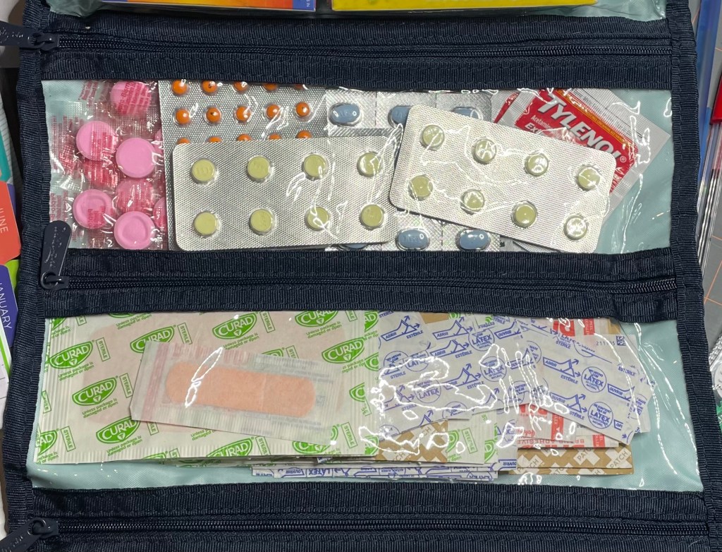 I also have a small first aid kit I keep in my purse that contains band aids, hydrocortisone cream, and my inhaler.