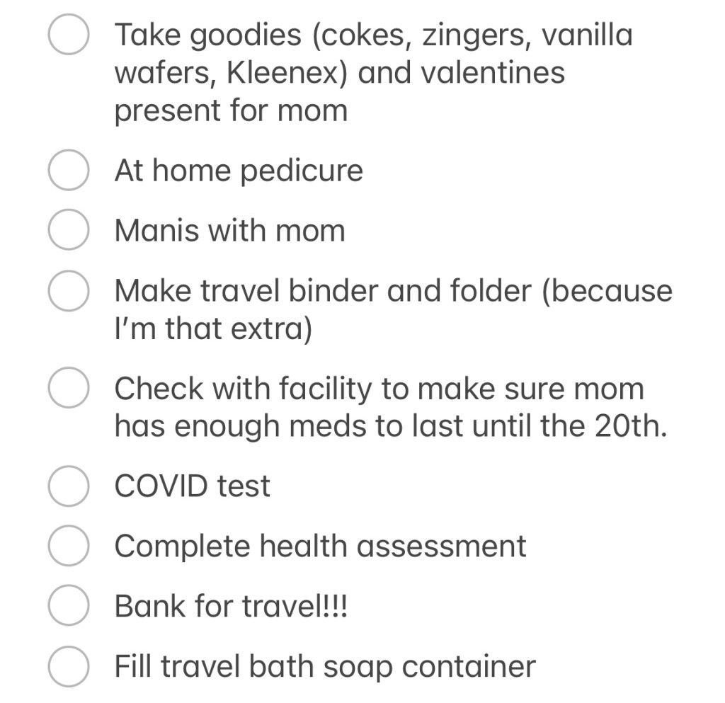 Since I’m at mom’s, I have given the front desk her emergency contact info for them to use while we are out of town. I have also spoke with the nursing staff to check her meds so I can order any refills and make sure they have them before we leave.