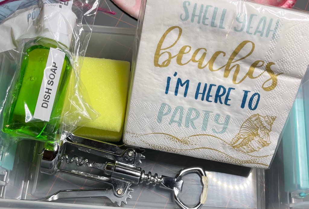 In a container, I have our corkscrew, napkins, dish soap, and a sponge so I can wash our glasses and our metal straws.