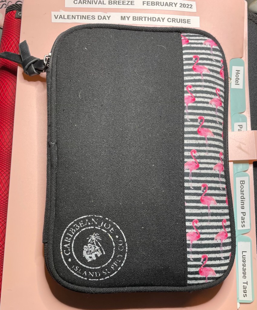 Finally, the last thing I use is our passport holder. Obviously this holds our passports but it also contains our vaccine cards, boarding pass, lanyards, and a magnetic card we use for keeping the lights on in our stateroom. At this time, it also has our appointment information for our rapid COVID test we have scheduled for later this week.