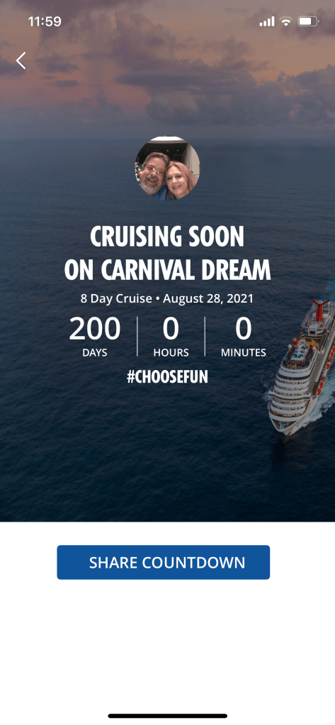 Option #1 is a cruise on the Carnival Dream leaving Galveston on August 28, 2021. It is an 8-night cruise with the same itinerary we already have booked. The pros, it is an itinerary we have not gone on. The cons, we were on this ship last year. We like the idea of going on a ship we have not been on but we will consider it as an option.