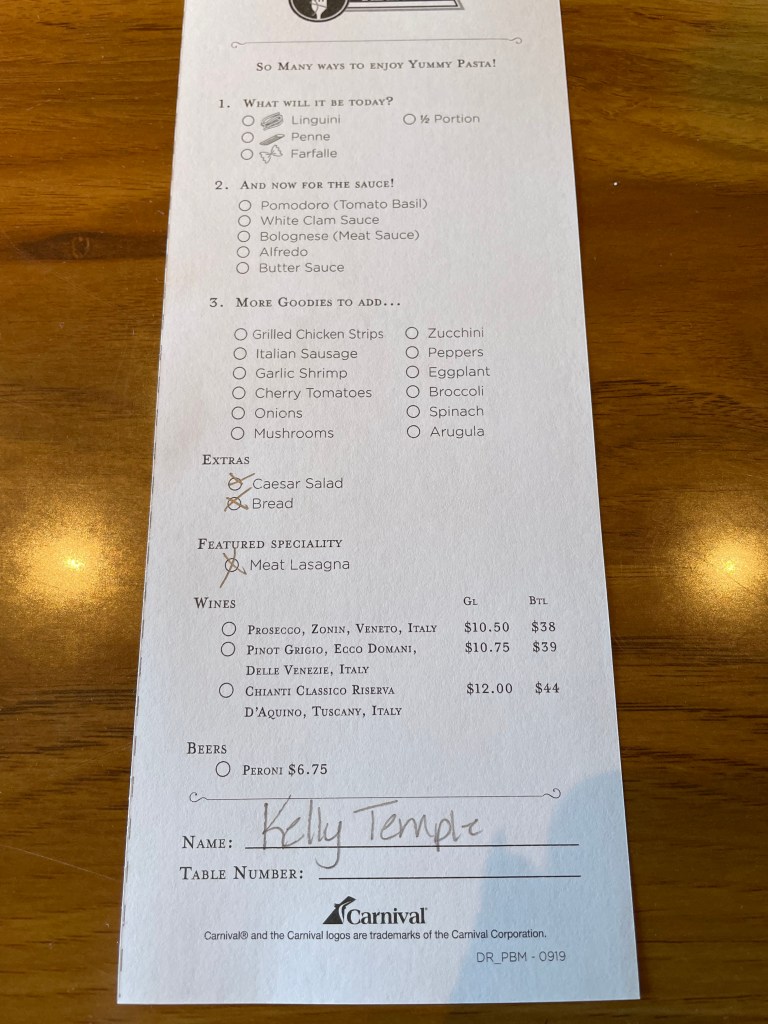 We decided to day would be a good day to have lunch at Cucina Del Capitano located on deck 11. For lunch, I had the Meat Lasagna, Caesar Salad, and bread while Jim had Linguini with Bolognese. We enjoy having lunch here as there is no charge for the lunch menu. If you decide you want to try Cucina Del Capitano in the evening, there is a $15 per person charge. They have an extensive dinner menu that I hope to try on a future cruise.