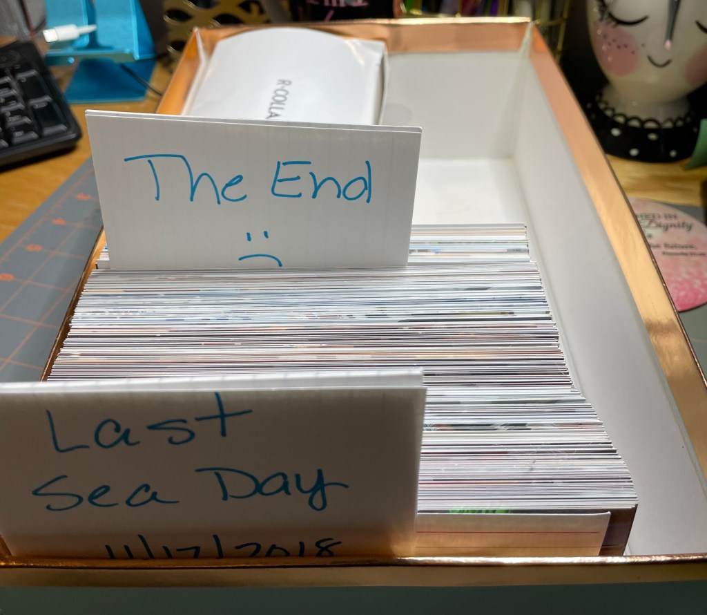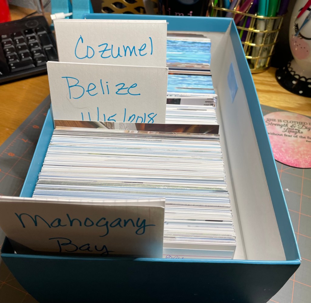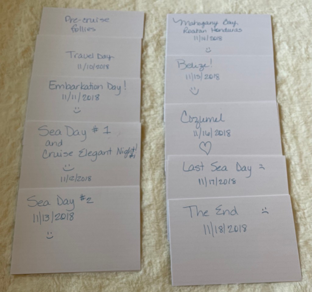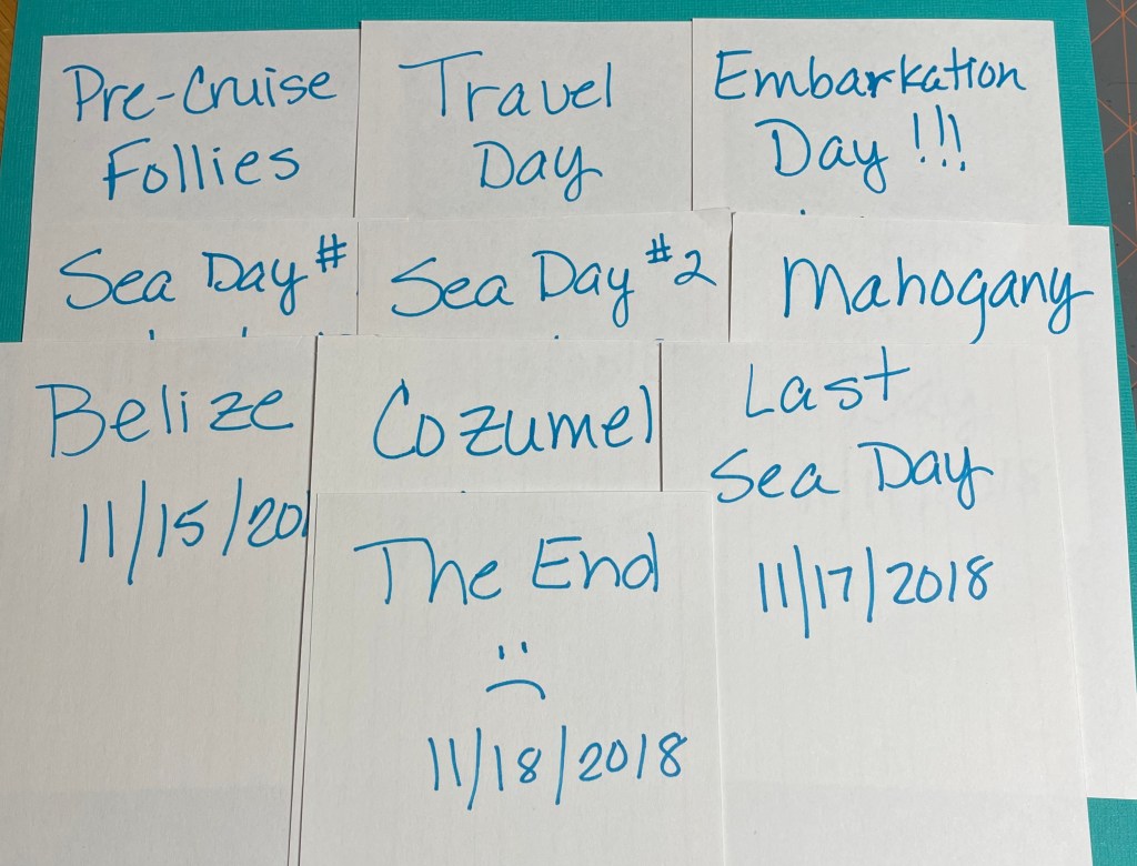 I knew I would need to divide the photos by section, so I made some dividers to use to separate the photos I would be storing in old shoe boxes. Apparently I did not plan well enough to have photo boxes on hand. Either that or I’m just blind and they are right in front of my face! So, I first made dividers to use in the photo albums for each section with the sections being: Precruise Follies, Travel Day, Embarkation, Sea Day #1, Sea Day #2, Mahogany Bay, Belize, Cozumel, Sea Day #3, and The End. I also made some dividers to divide the photos into sections. And then I made some divider cards to use within each section. One for photos chosen for possible scrapbook page and one for the photos that will go in the photo album.
