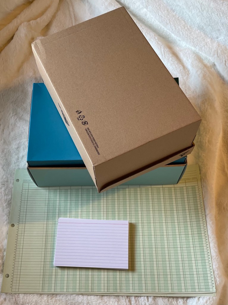 To begin the next part of my project, I would need index cards, a columnar pad, and photo boxes. Unfortunately, I did not have any photo boxes on hand, at least none that I could find. So I suppose shoe boxes will have to work, at least temporarily.