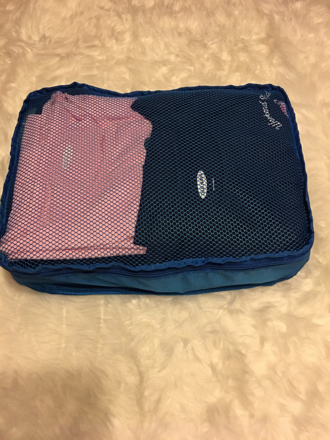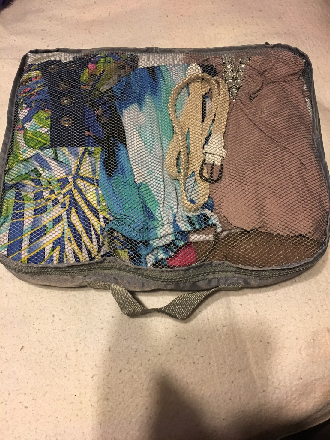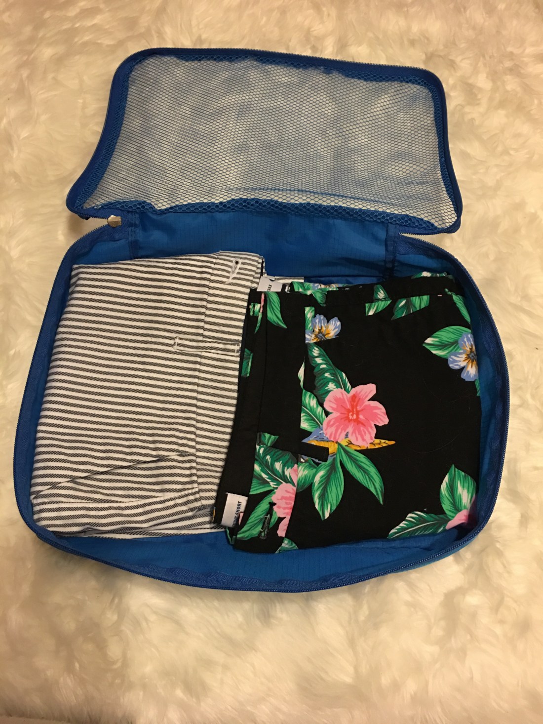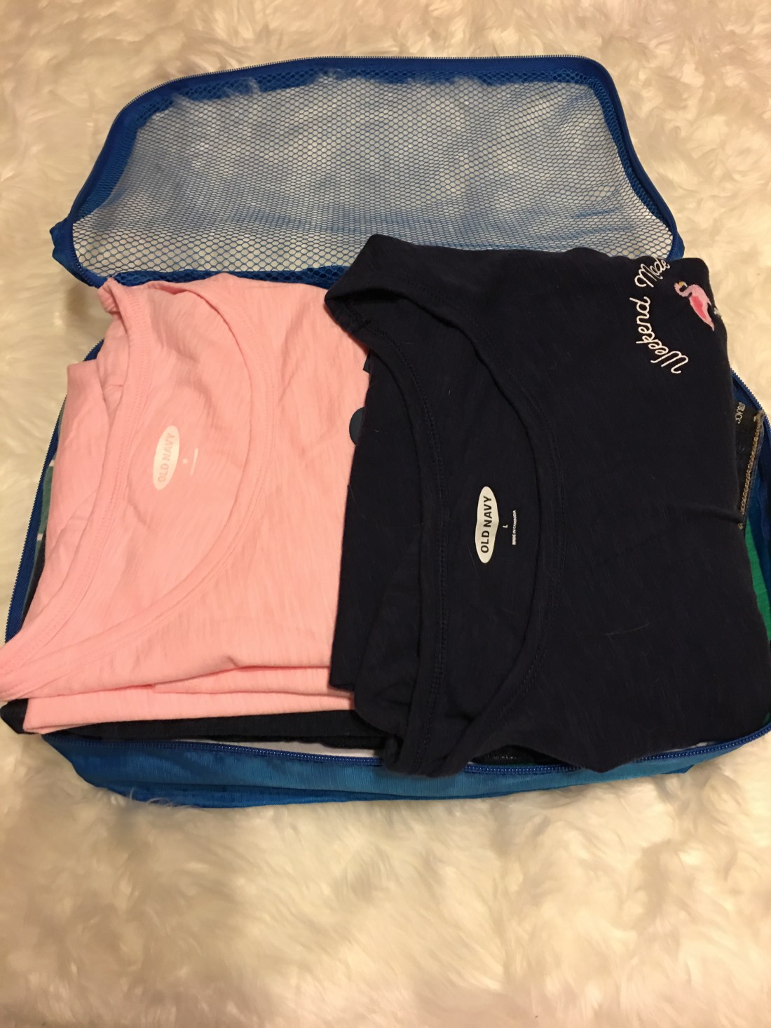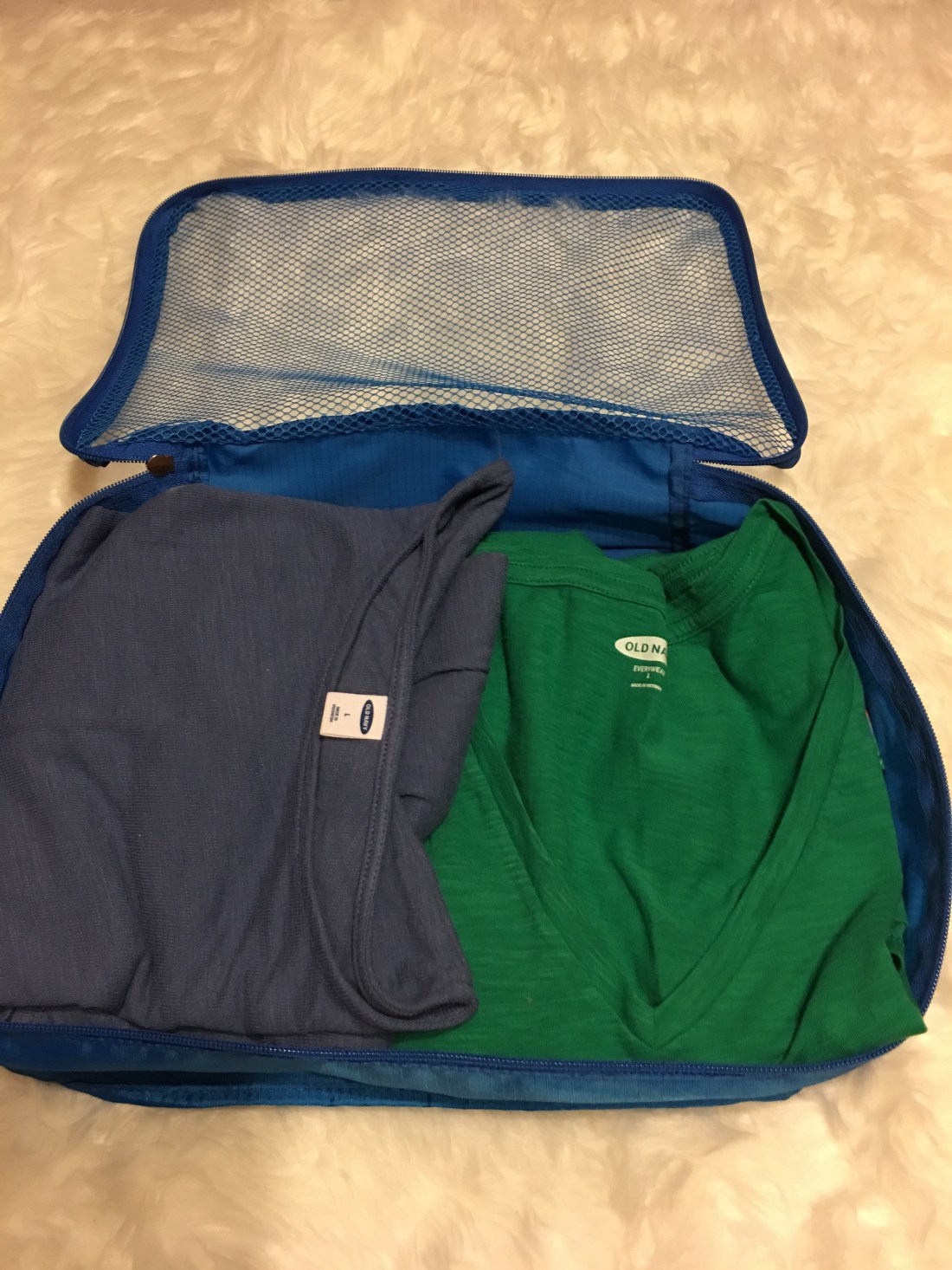 I decided to use the large cube for what I consider daytime clothes… shorts and shirts to wear around the ship and at the various ports of call. I tried the rolling technique and the regular folding and found that regular folding works out best for me. Everything fit in the cube nicely and doesn’t feel like they clothes are shoved into the cube.