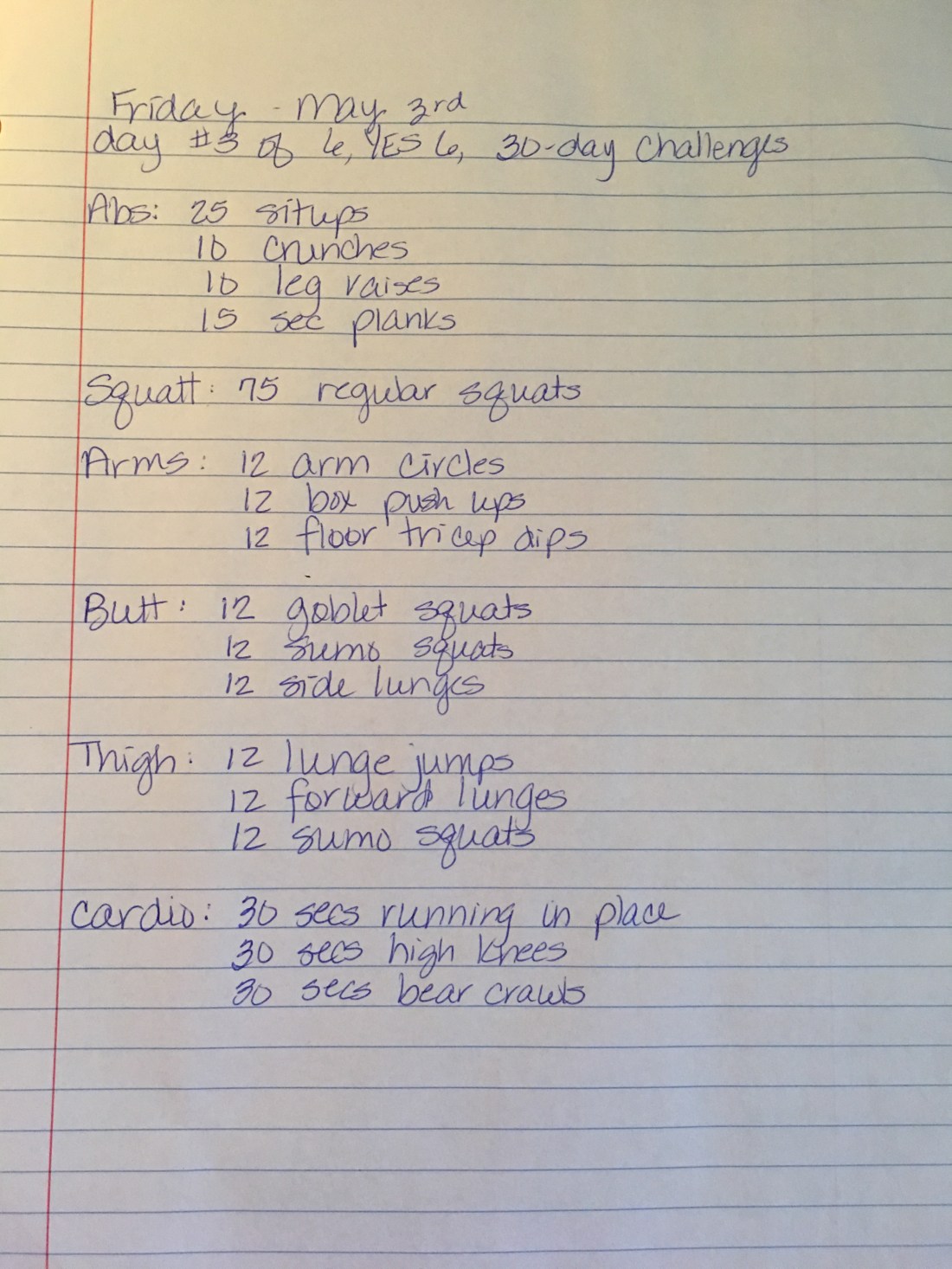 ABS: 30 sit ups, 12 crunches, 12 leg raises, and 20 second plank.