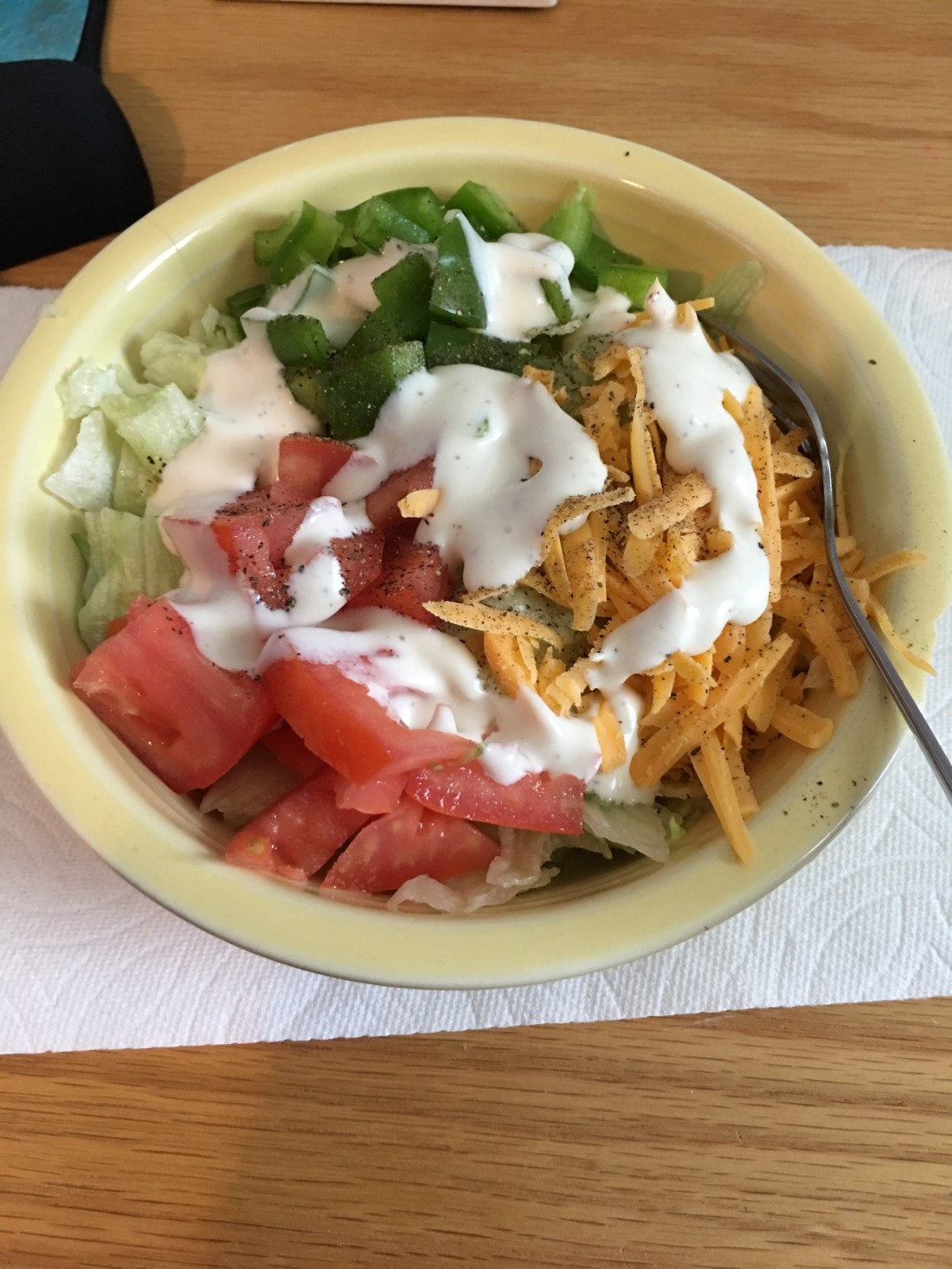 12:30 salad consisting of lettuce, tomatoes, bell peppers, cheese, and ranch dressing. Water to drink.