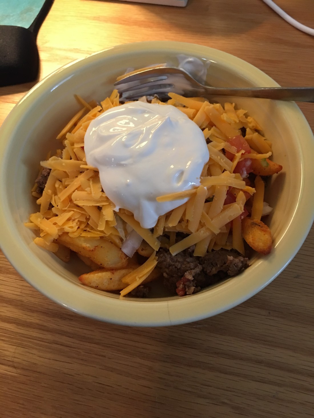 7:00 what can only be described as taco fries! Air fried fries, taco meat, pico de gallo, onions, cheese, and sour cream.