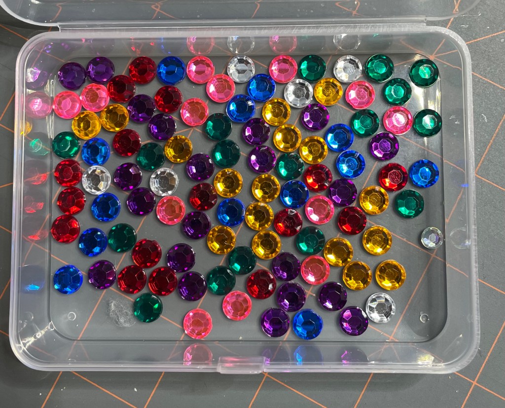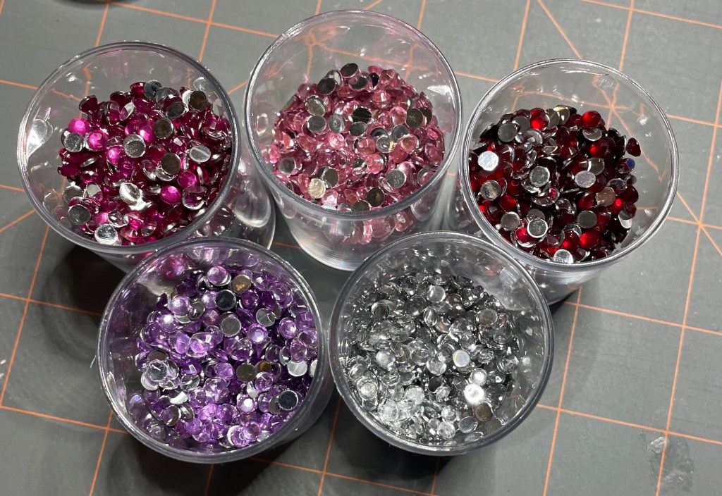 Rhinestones in several colors and a couple of different sizes, all purchased from Amazon, also to be used on Christmas frames for my daughter.
