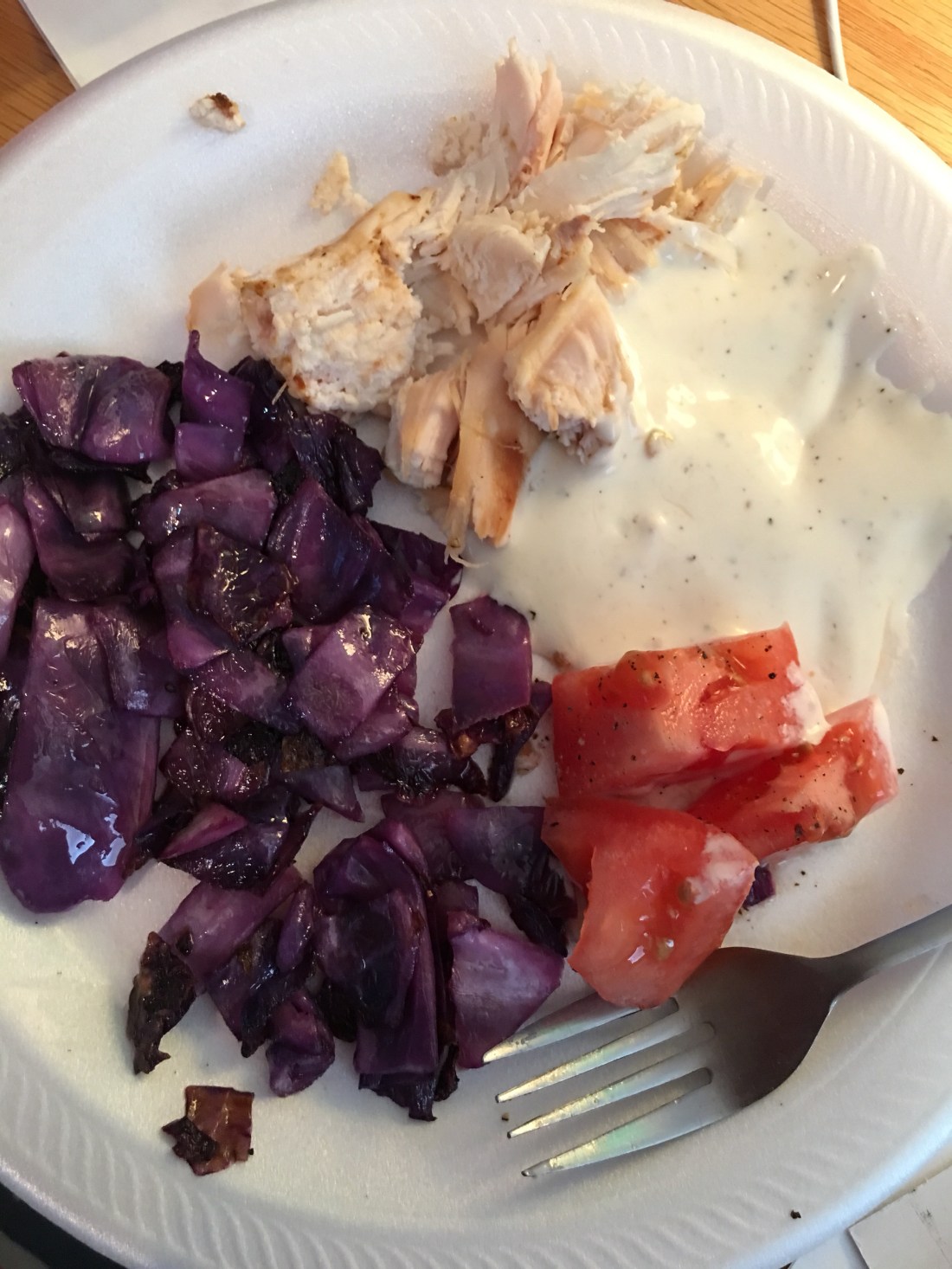 Breakfast/lunch consisted of chicken, purple cabbage cooked in butter, and tomato wedges with some Ranch for dipping.  I even dip my chicken in Ranch… don’t judge!!!!  I have always known that everything is better with butter but I’m really enjoying it more than I have in the past.