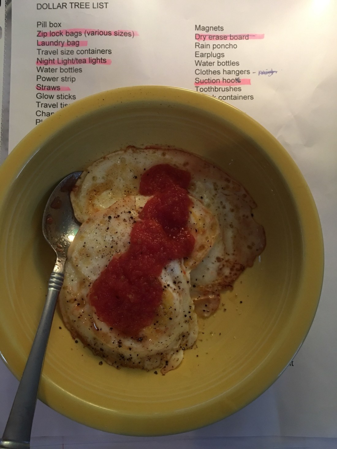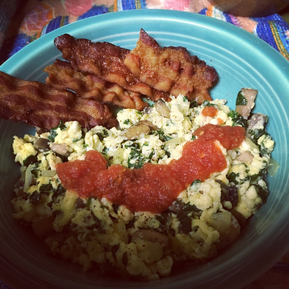After a VERY GOOD nights sleep, I woke up and had my normal coffee.  I didn’t eat anything until after 11am. At that time I had a brunch consisting of bacon and scrambled eggs with spinach, mushrooms, and onions topped with hot sauce.  And I couldn’t eat it all!!!  A stayed full for the remainder of the day.
