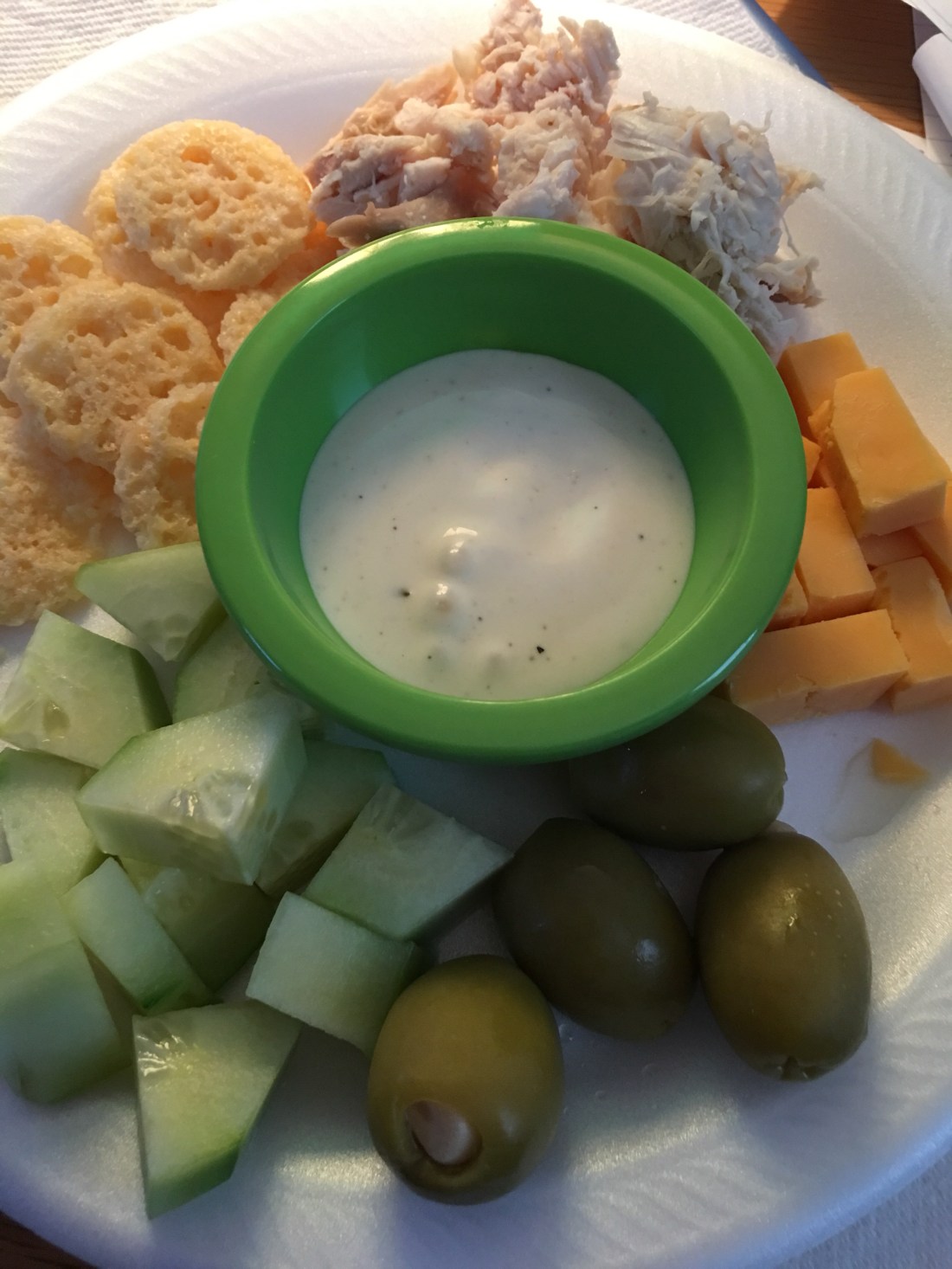 Around 6 I was a little hungry so I fixed a plate of shredded chicken, cheese cubes, olives stuffed with garlic, cucumbers, Parmesean cheese whisps, and ranch dressing for dipping.  I ate all of the olives and some of the cheese cubes, a few of the whisps, and just a little bit of the cheese.  Once I was full, that was it.