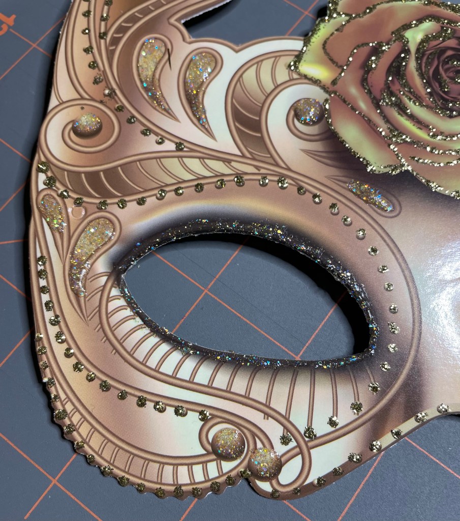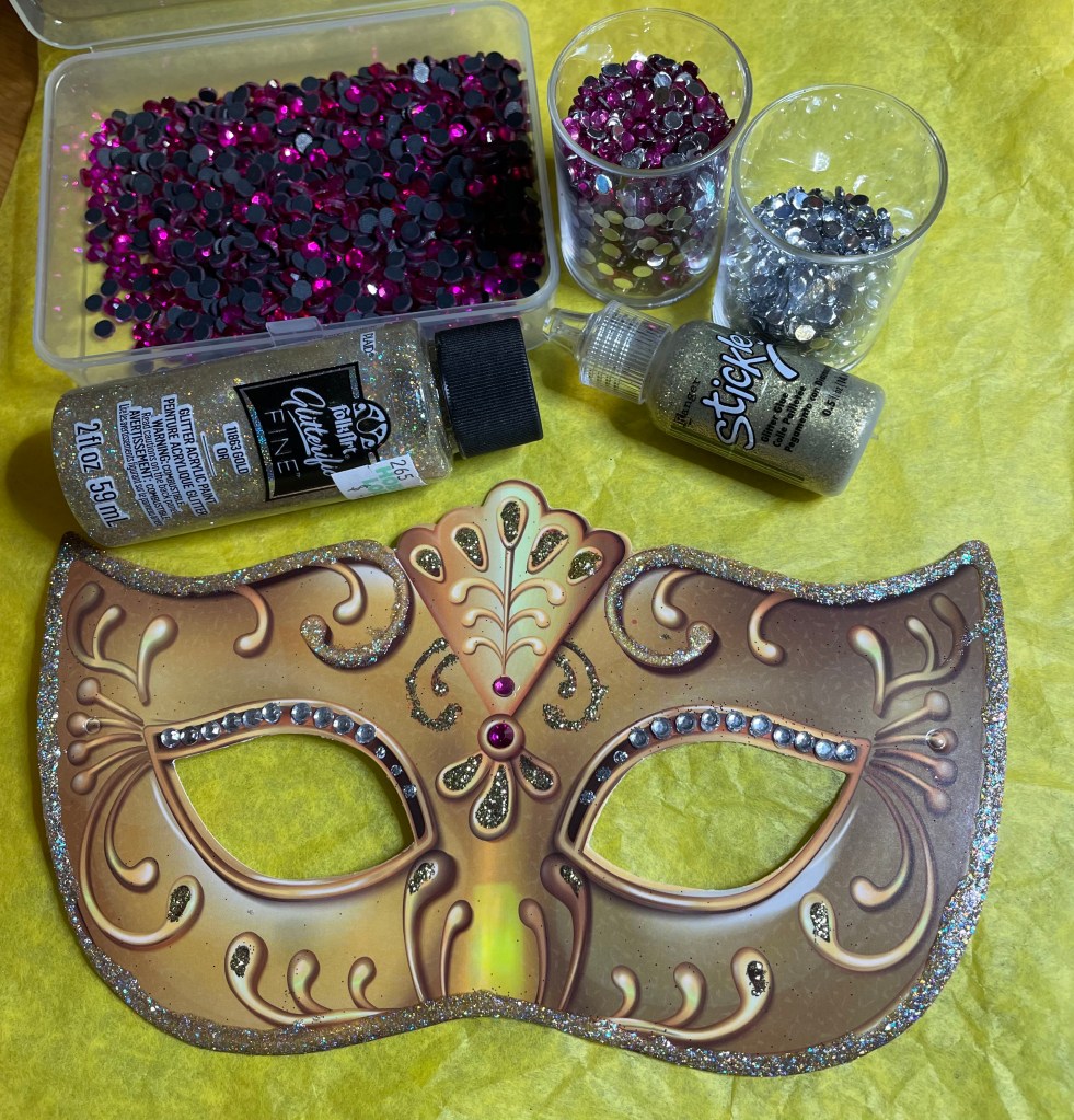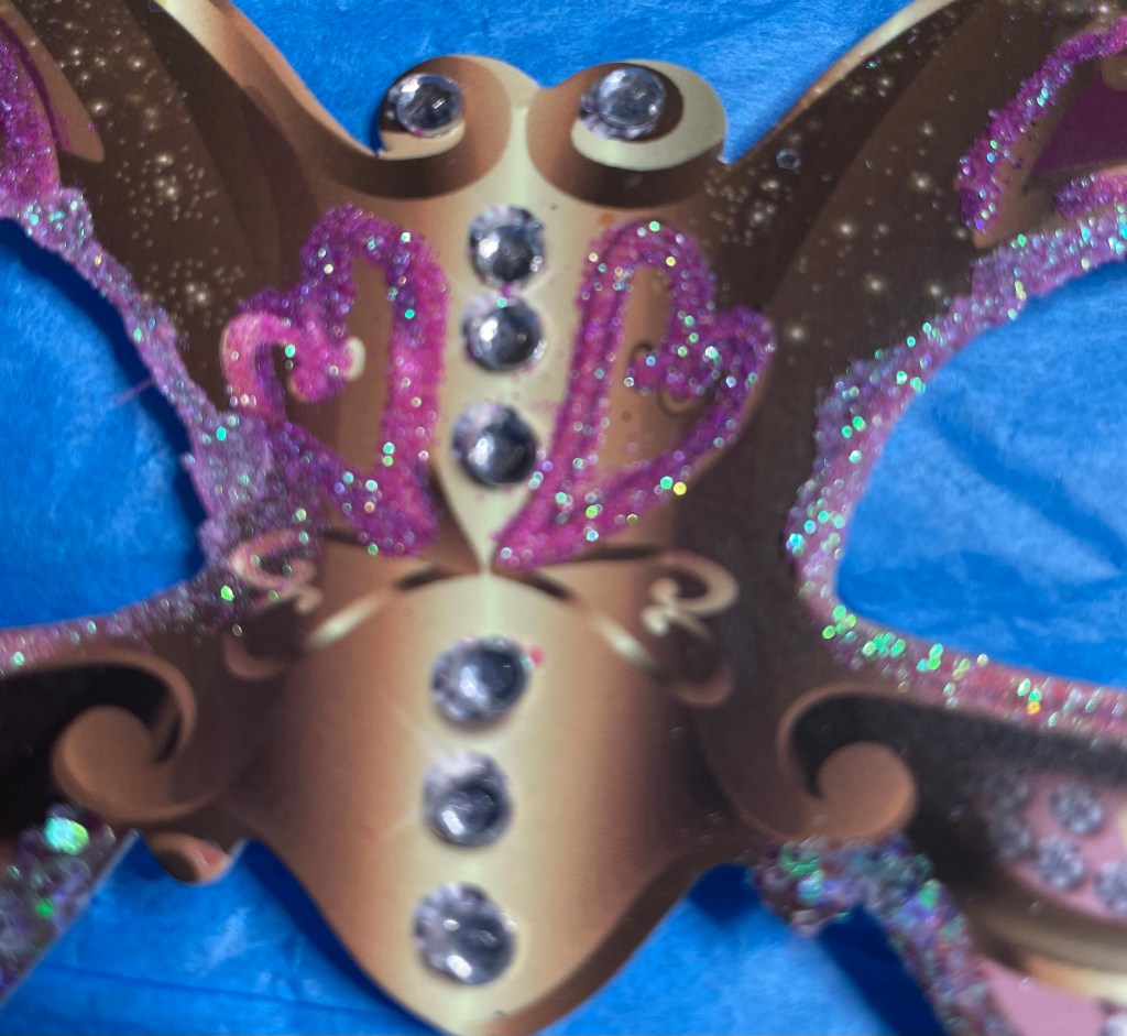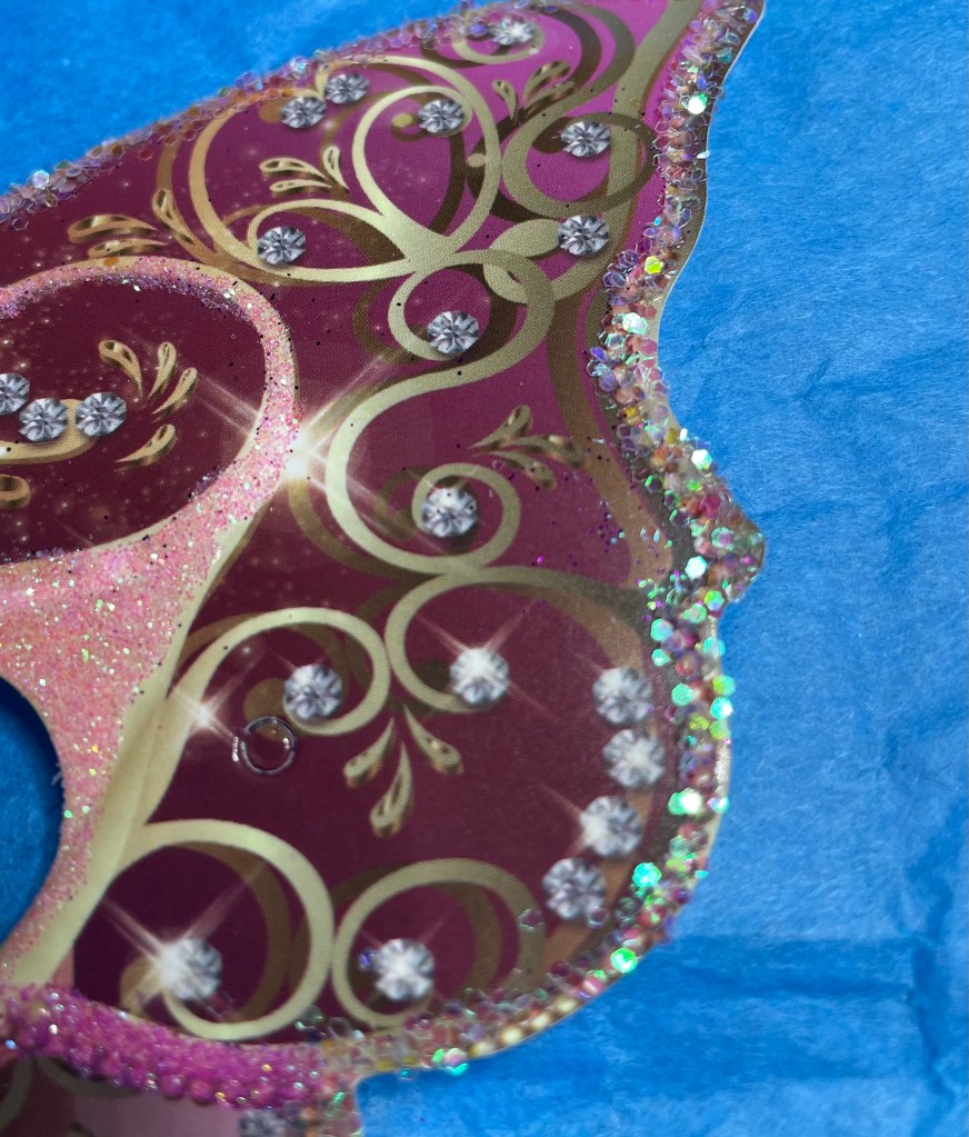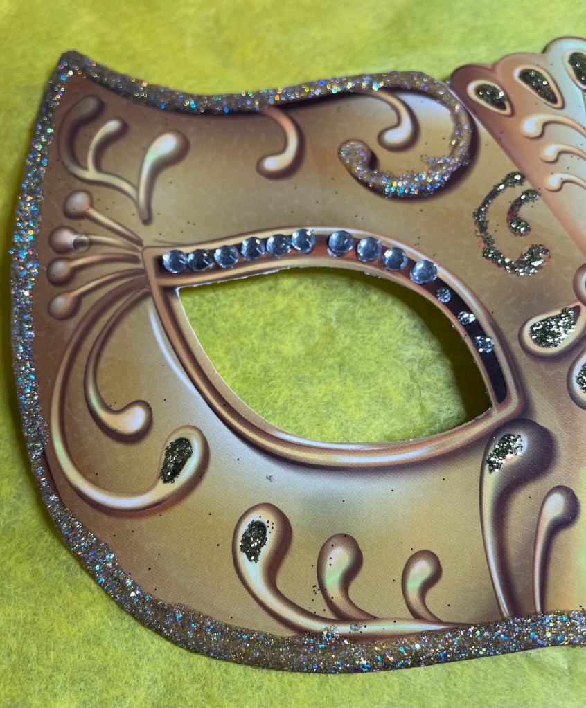 Mask #8 did not have a before picture, but the outcome is fantastic, at least in my opinion. One large(ish) and one small rhinestone in a deep pink color was used as accents in middle area of the mask. Silver rhinestones were placed around the eyes. Gold and silver stickles were used to accent a few areas, gold in the center top area and silver below the eyes. Gold Glitterific was used around most of the outer edge of the mask.