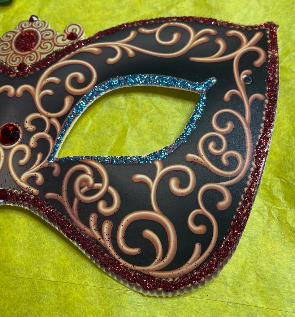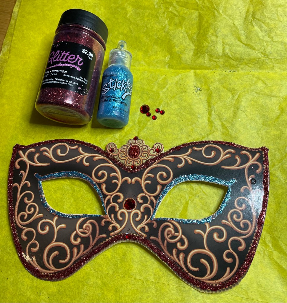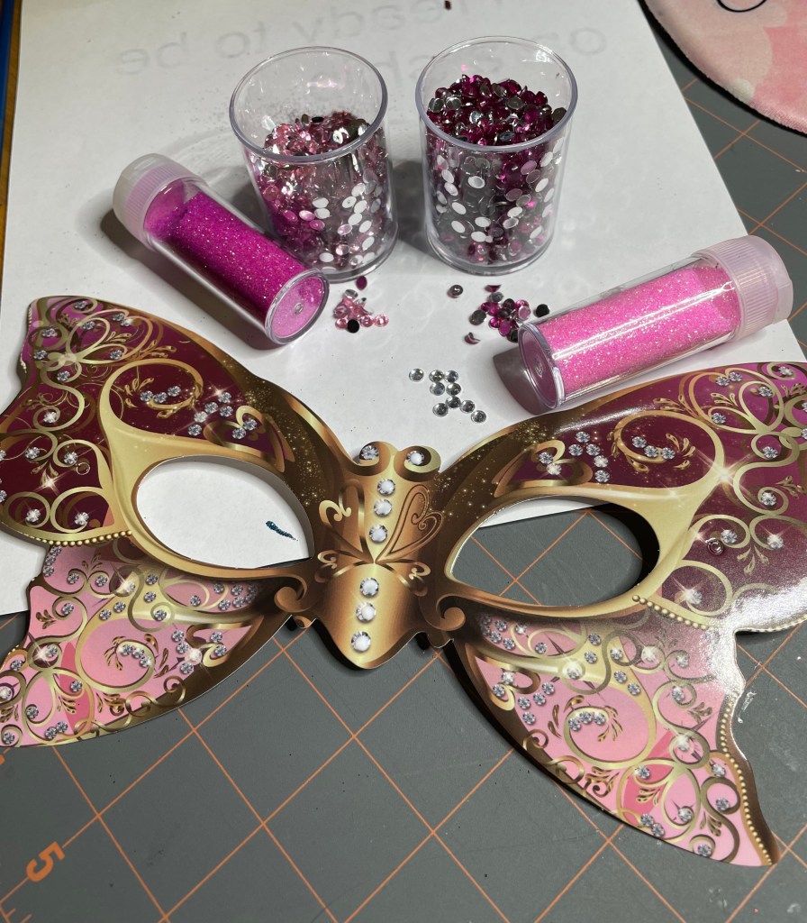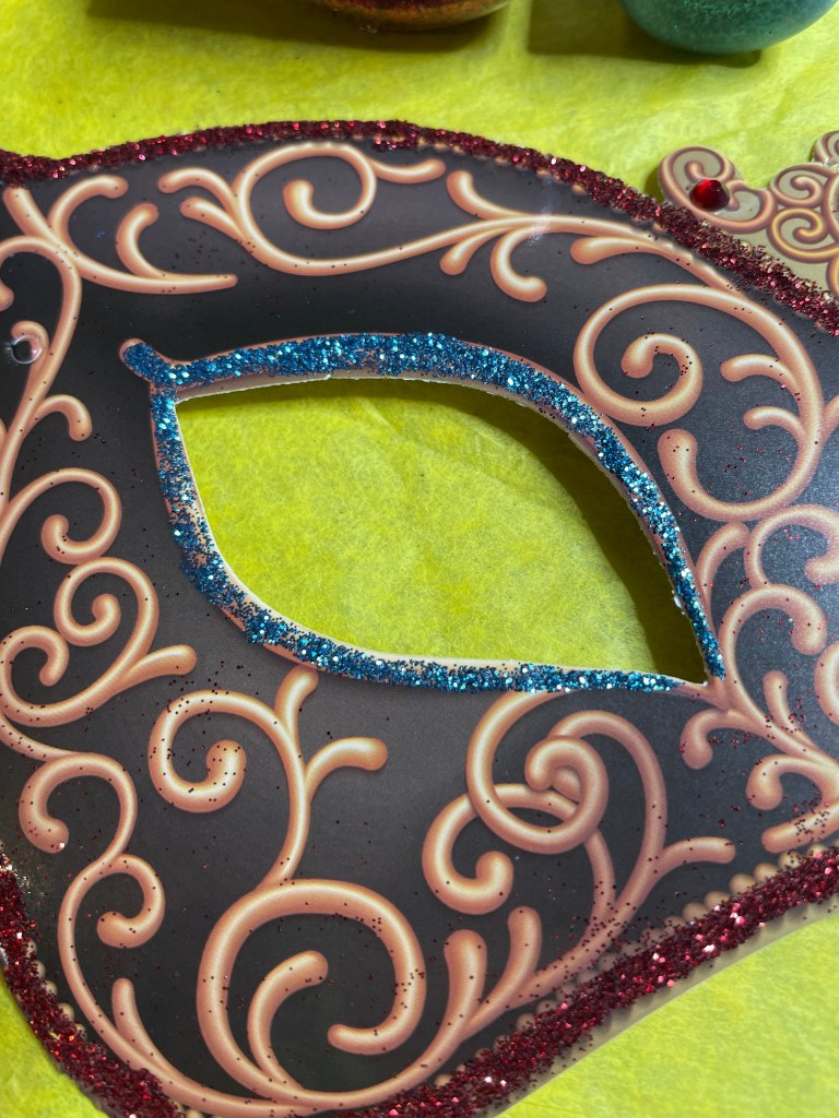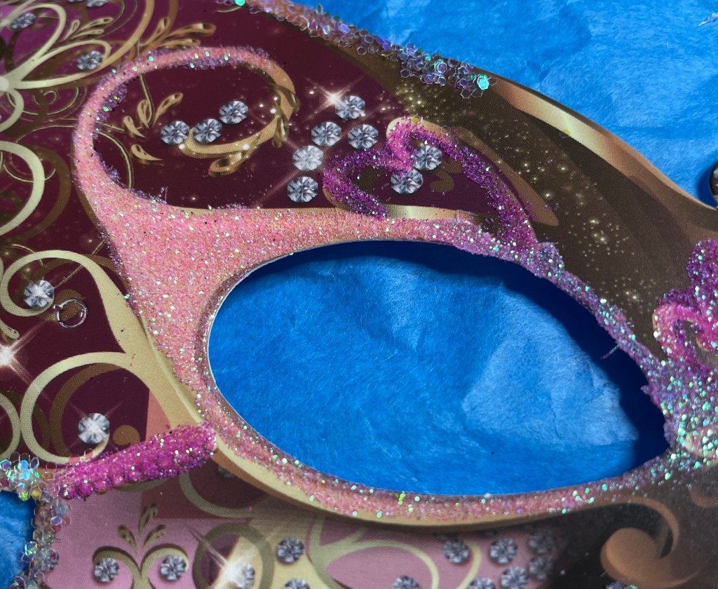 Mask #8 did not have a before picture, but the outcome is fantastic, at least in my opinion. One large(ish) and one small rhinestone in a deep pink color was used as accents in middle area of the mask. Silver rhinestones were placed around the eyes. Gold and silver stickles were used to accent a few areas, gold in the center top area and silver below the eyes. Gold Glitterific was used around most of the outer edge of the mask.