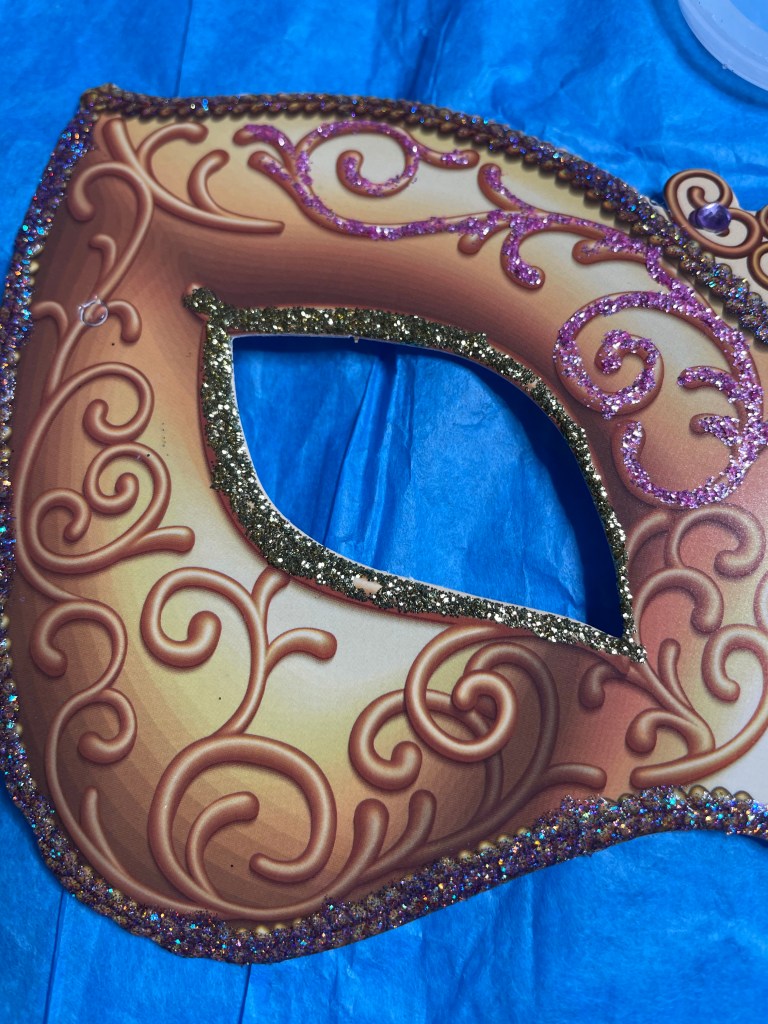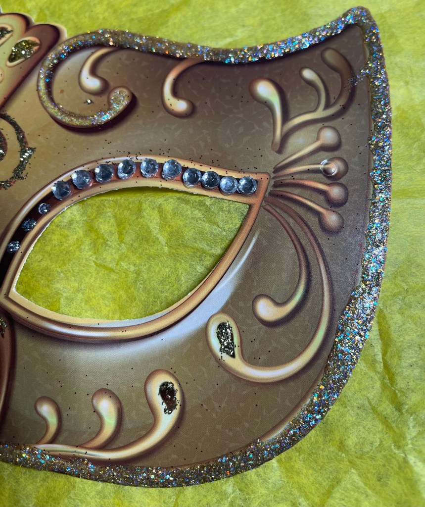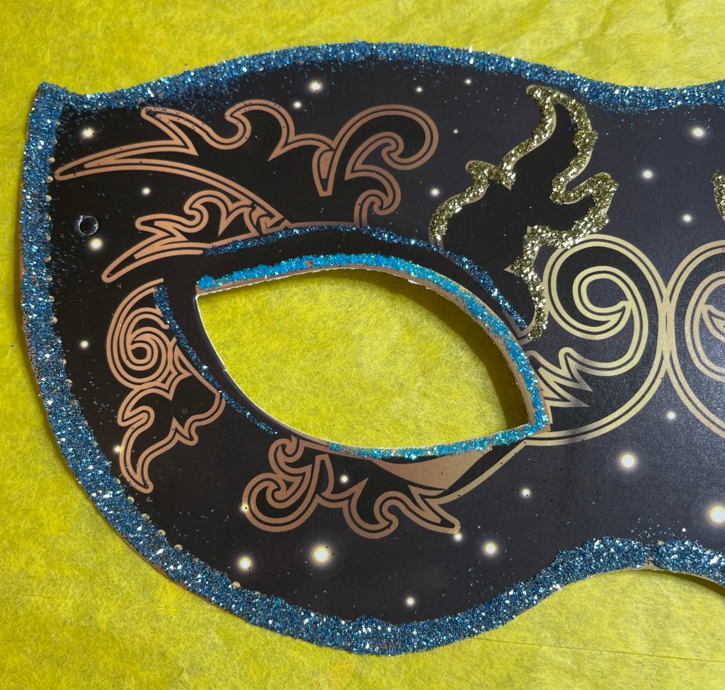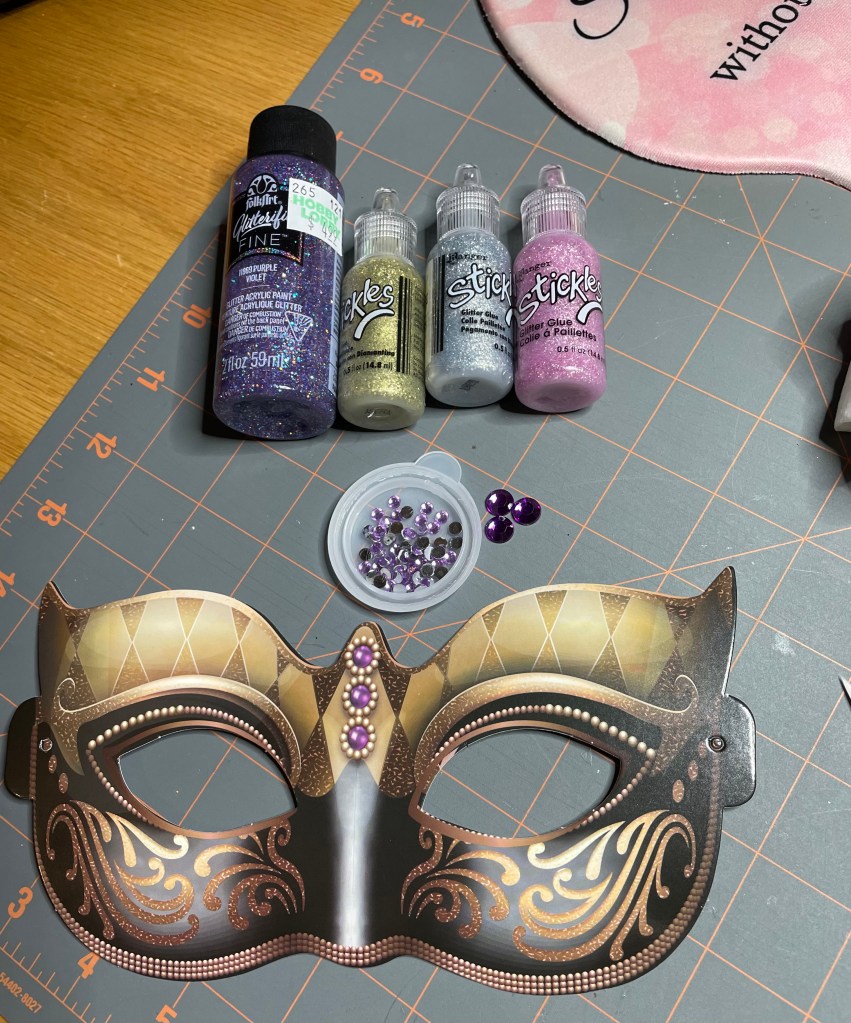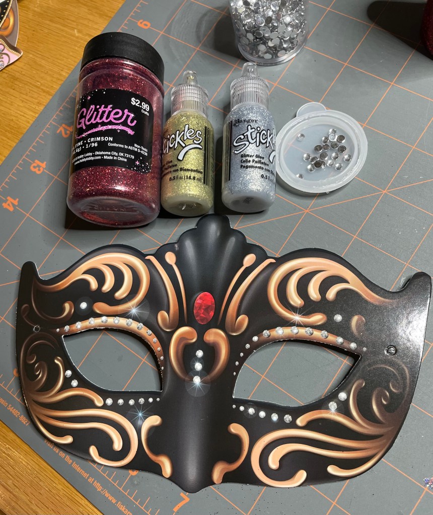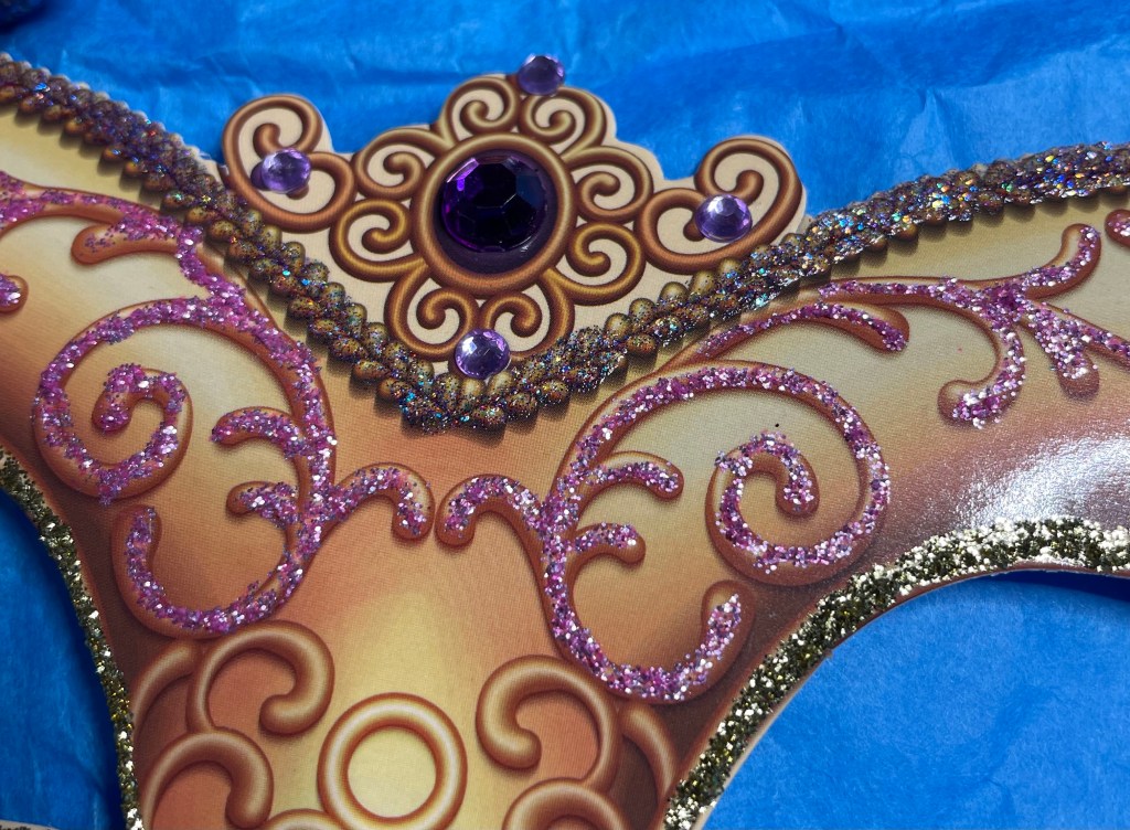 Mask #8 did not have a before picture, but the outcome is fantastic, at least in my opinion. One large(ish) and one small rhinestone in a deep pink color was used as accents in middle area of the mask. Silver rhinestones were placed around the eyes. Gold and silver stickles were used to accent a few areas, gold in the center top area and silver below the eyes. Gold Glitterific was used around most of the outer edge of the mask.