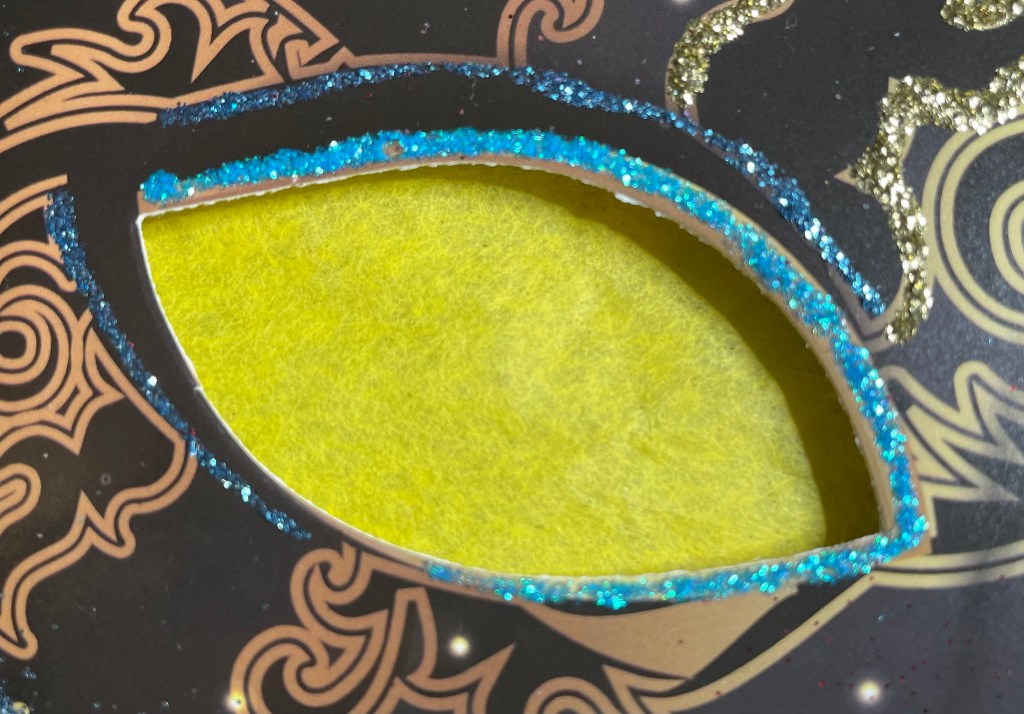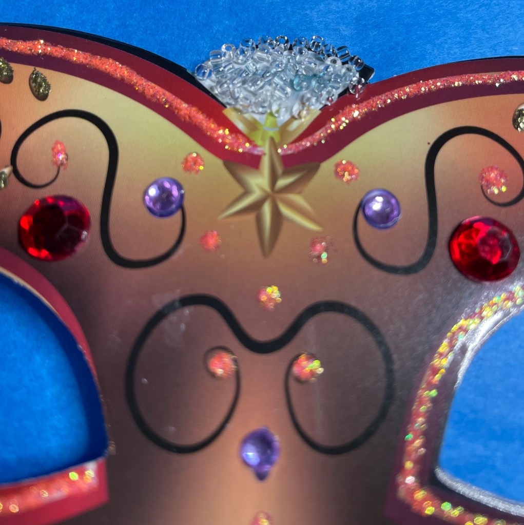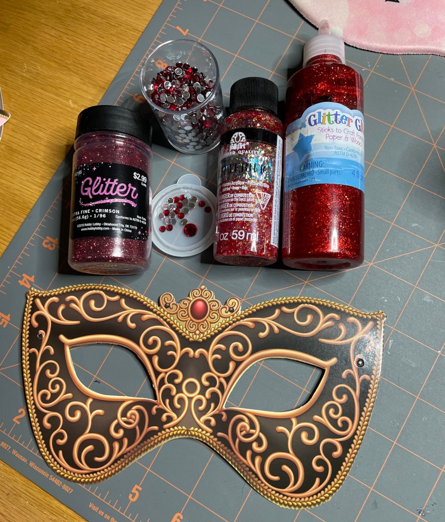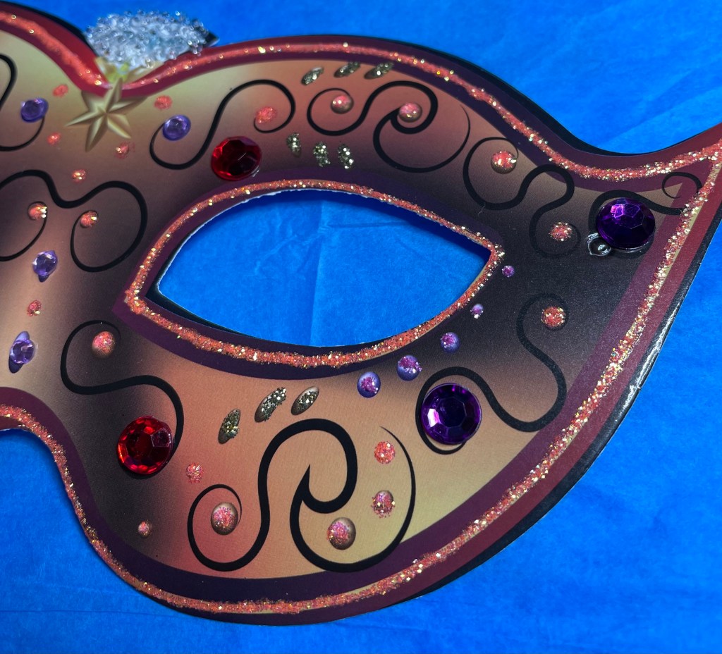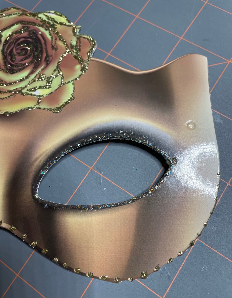 Mask #8 did not have a before picture, but the outcome is fantastic, at least in my opinion. One large(ish) and one small rhinestone in a deep pink color was used as accents in middle area of the mask. Silver rhinestones were placed around the eyes. Gold and silver stickles were used to accent a few areas, gold in the center top area and silver below the eyes. Gold Glitterific was used around most of the outer edge of the mask.