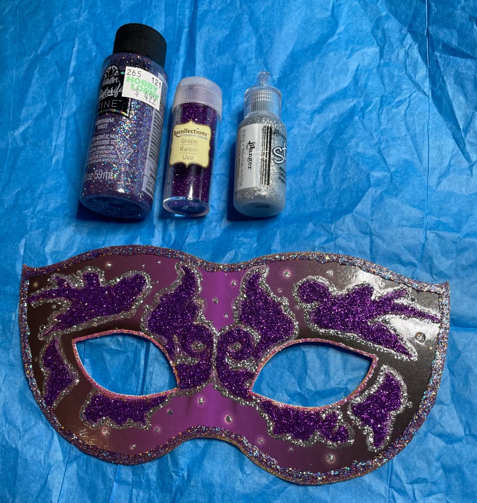 Mask #11 gave me a lot of trouble. There were a lot of things I thought would work but it just didn’t. I’m not sure I am even going to use this when I decorate my mom’s door. I guess I could put it on back of the tree where no one can see it. That might work. The used fine glitter in the color grape, silver Stickles, and purple Glitterific paint around the out edge. This one was tough but the last mask was the real challenge.