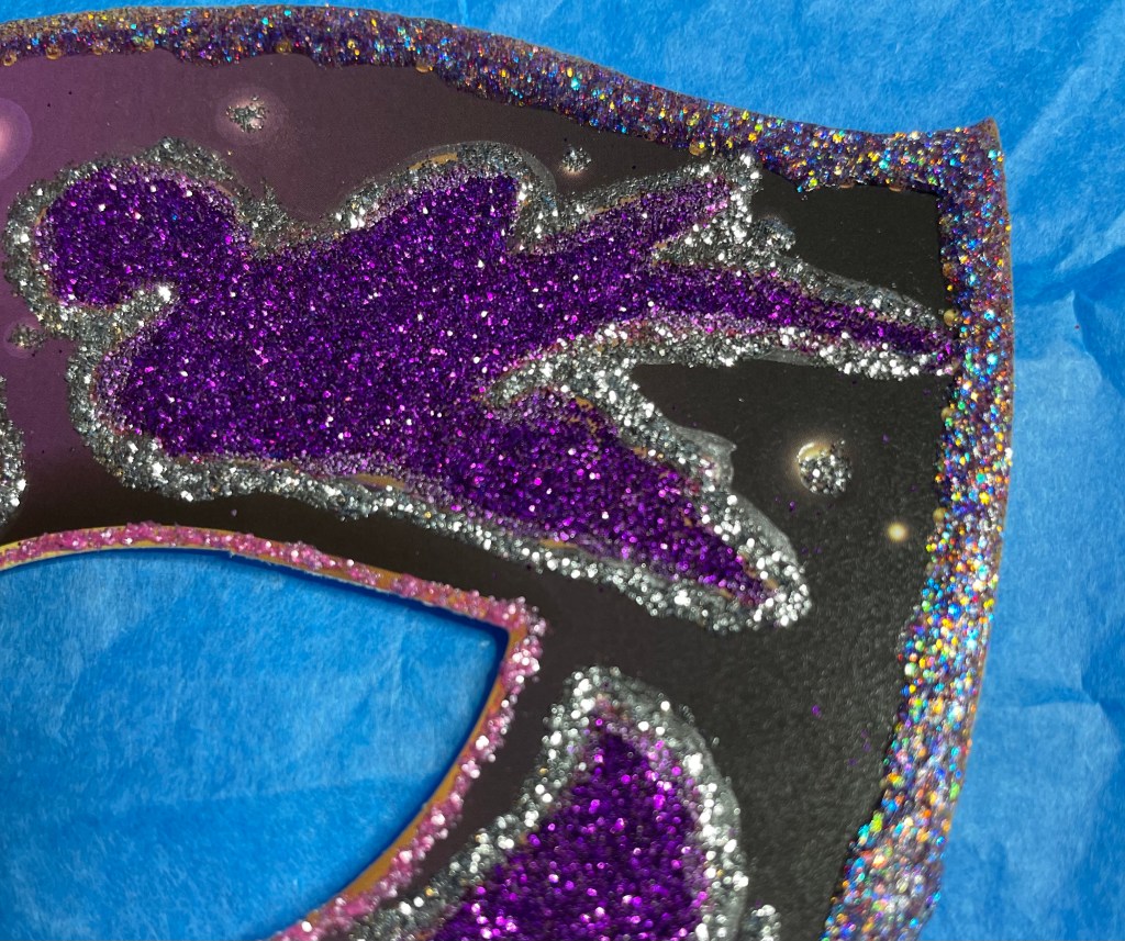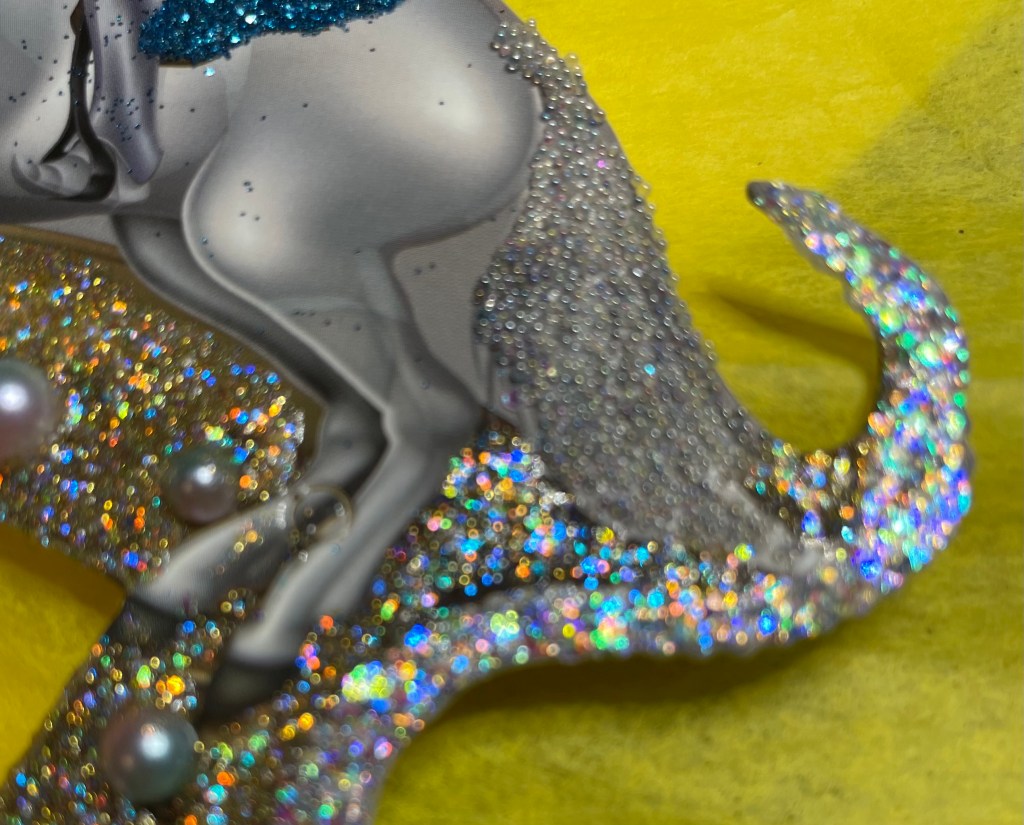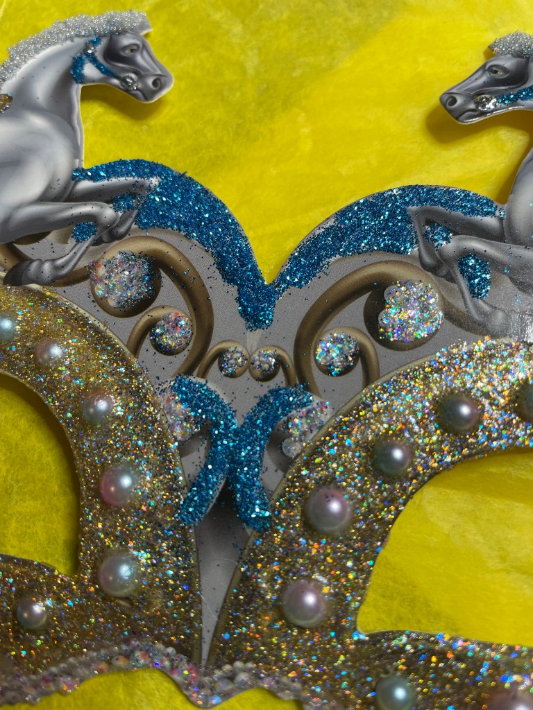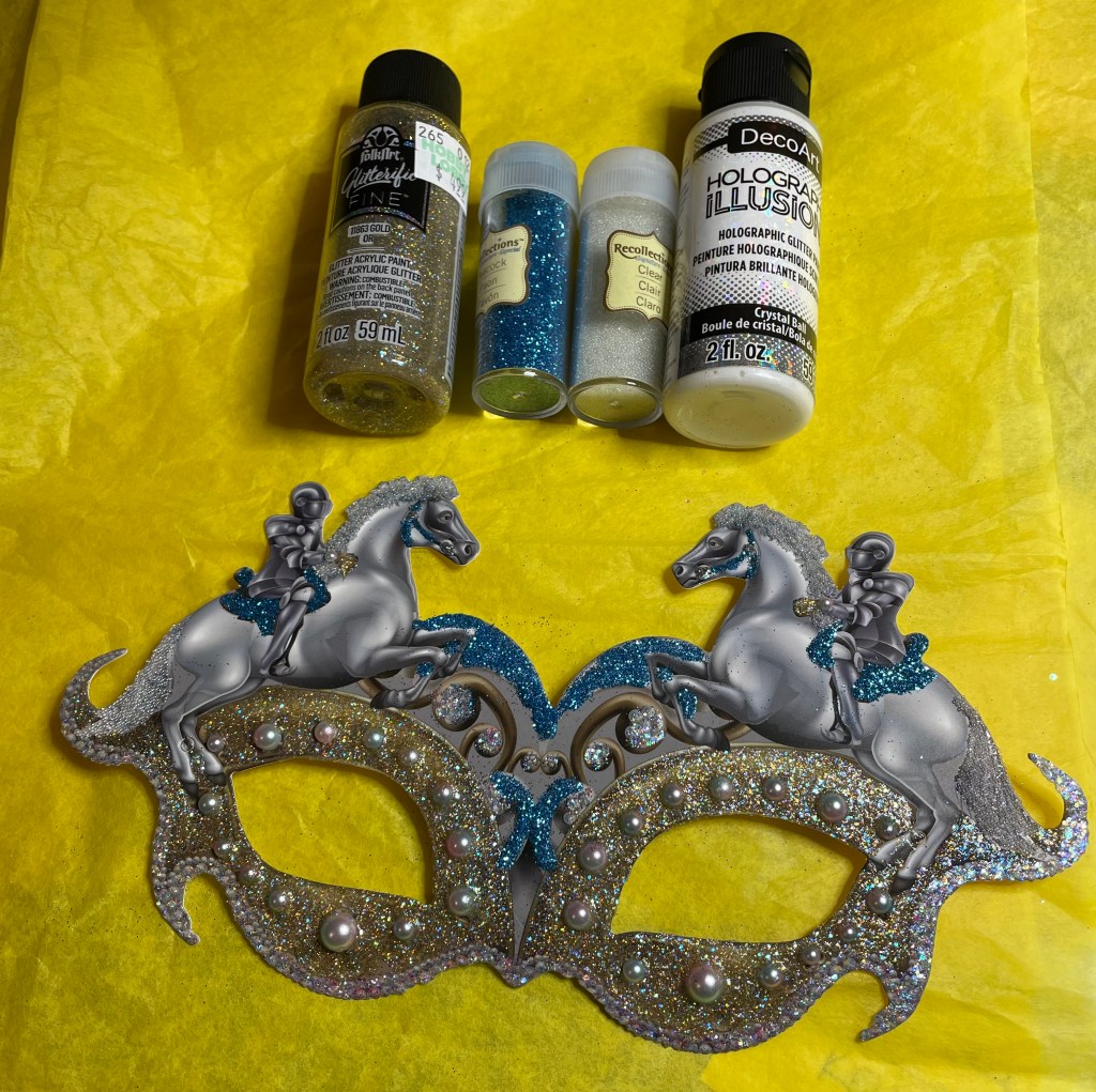 Mask #12 gave me nightmares and was always on my mind as to how I could possible make this mask really stick out above all the rest. In the beginning, I thought I would be able to use some faux pearls and some micro beads to make it pop. To test out my idea using the micro beads, I decided to try it on the mane and tail of each horse. They stuck thanks to Nuvo Deluxe Adhesive. But working with the beads was a real challenge. I decided that the hair would be the only area the beads would be used. Now I had to figure something else out. I decided the pearls would not give me the outcome I was wanting for the bottom edge of the mask so that mean I would have to go shopping. I quick stop at Michaels and Hobby Lobby in search of something but not sure what. I knew I wanted a paint product. I do not remember which store I purchased which product at but I came home with DecoArt Metallic paint in White Pearl from Michaels and DecoArt Holographic Illusions in the color Crystal Ball from Hobby Lobby. Once home, I quickly discovered the metallic pain would not work. So I have put it aside to use for another project down the line. The holographic illusions paid worked perfectly along the bottom edge of the mask. I decided to use the faux pearls in the eye area then use gold Glitterific for the remainder of the eye area. Holographic illusions was also used in the top area where there are what looks like pearl clusters. To really make things pop, I decided to use fine glitter in the color peacock for the saddle. I’m happy with how this mask turned out. It definitely took a long time to get this mask finished.