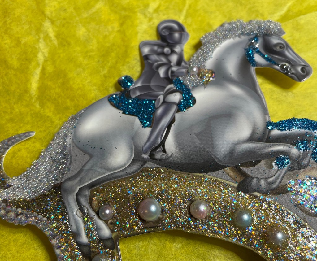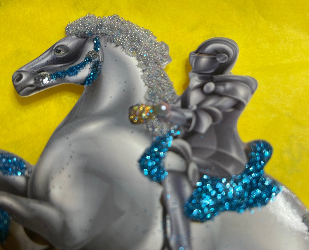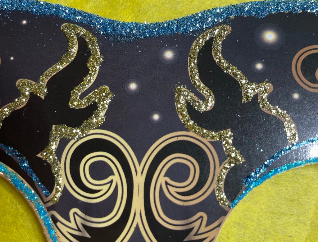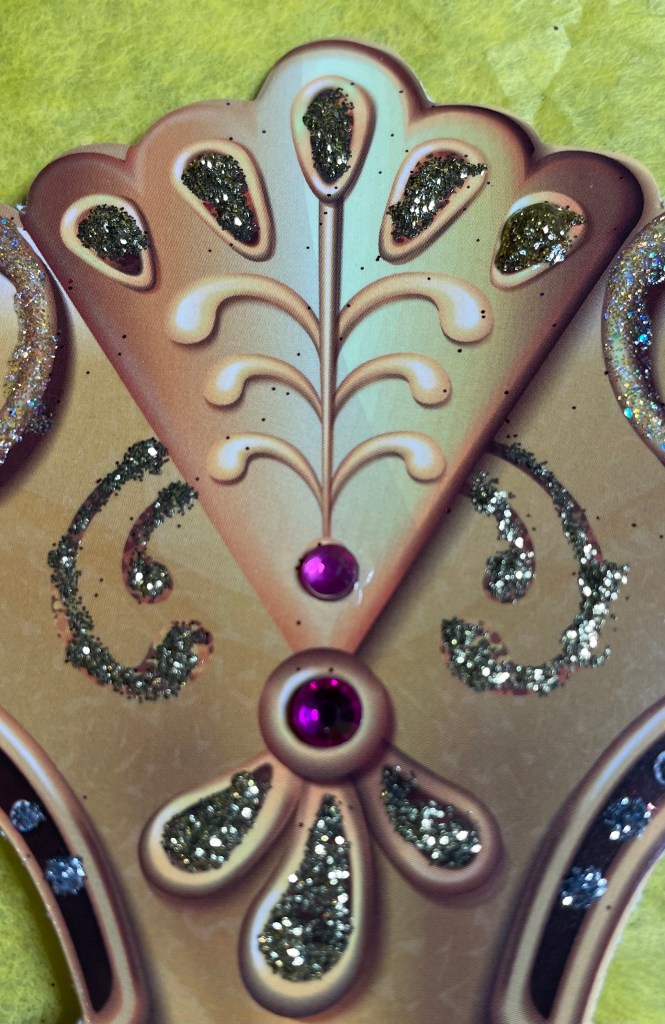 Mask #12 gave me nightmares and was always on my mind as to how I could possible make this mask really stick out above all the rest. In the beginning, I thought I would be able to use some faux pearls and some micro beads to make it pop. To test out my idea using the micro beads, I decided to try it on the mane and tail of each horse. They stuck thanks to Nuvo Deluxe Adhesive. But working with the beads was a real challenge. I decided that the hair would be the only area the beads would be used. Now I had to figure something else out. I decided the pearls would not give me the outcome I was wanting for the bottom edge of the mask so that mean I would have to go shopping. I quick stop at Michaels and Hobby Lobby in search of something but not sure what. I knew I wanted a paint product. I do not remember which store I purchased which product at but I came home with DecoArt Metallic paint in White Pearl from Michaels and DecoArt Holographic Illusions in the color Crystal Ball from Hobby Lobby. Once home, I quickly discovered the metallic pain would not work. So I have put it aside to use for another project down the line. The holographic illusions paid worked perfectly along the bottom edge of the mask. I decided to use the faux pearls in the eye area then use gold Glitterific for the remainder of the eye area. Holographic illusions was also used in the top area where there are what looks like pearl clusters. To really make things pop, I decided to use fine glitter in the color peacock for the saddle. I’m happy with how this mask turned out. It definitely took a long time to get this mask finished.