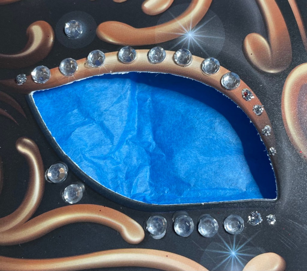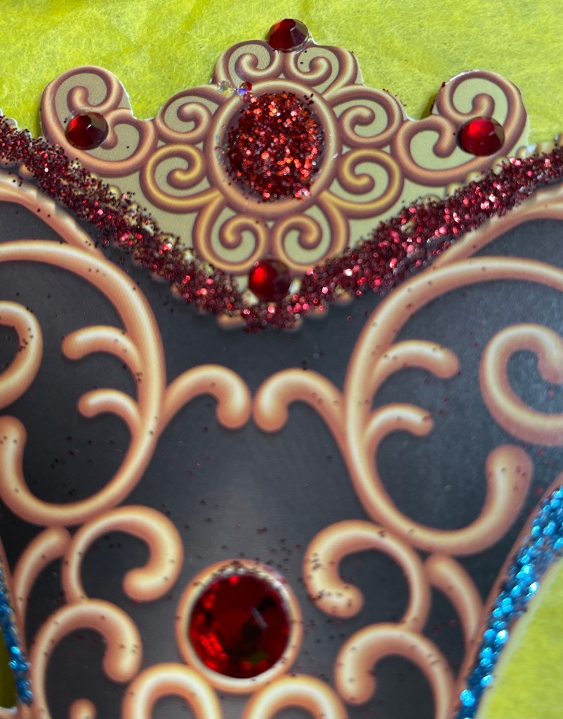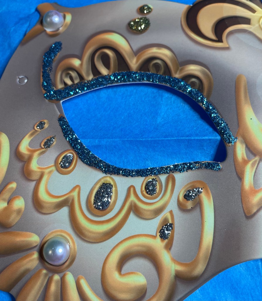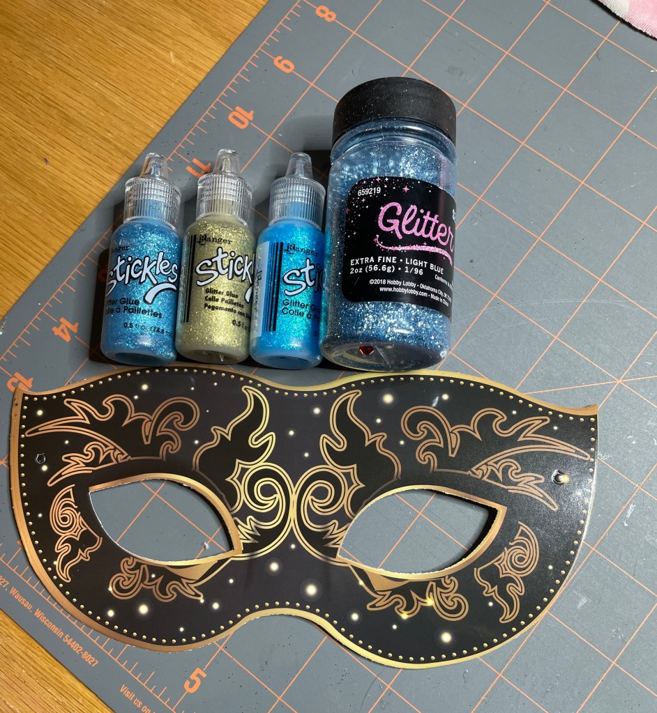 By the time I got to mask #4, I decided it was time to do something more simple. Along the lines of less is more. Blue rhinestones and faux pearls made great accents as did the gold and silver Stickles. But I think my favorite part is the blue Stickles around the eyes. Yes, that is definitely my favorite part of this mask.