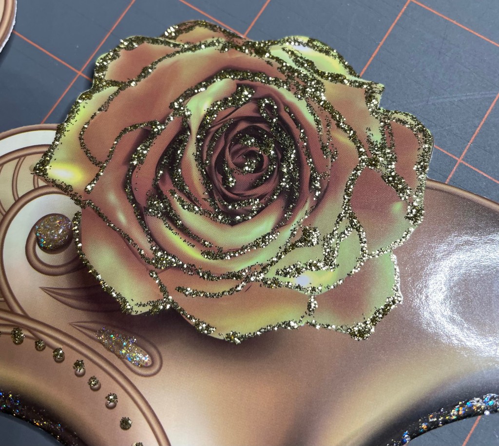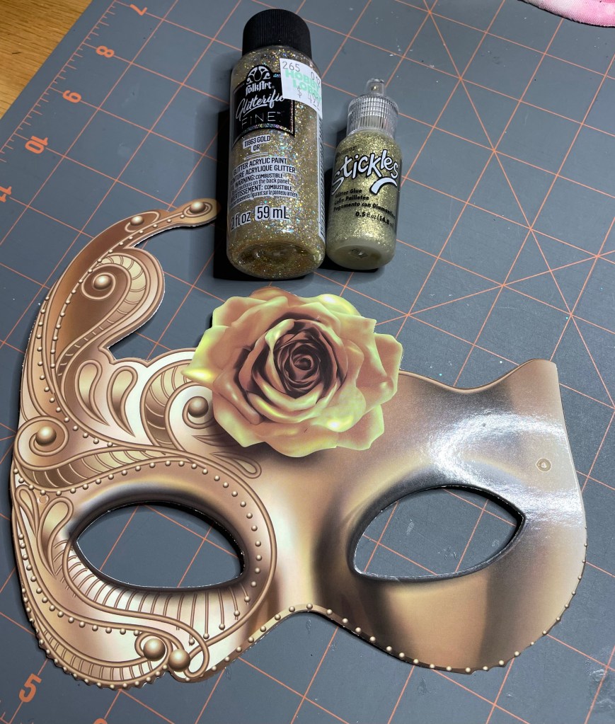 The first mask I worked on is the one with a yellow rose. My mom loves yellow roses so it just seem appropriate to use it. I used Folkart Glitterific in the color gold, purchased at Hobby Lobby and gold Stickles purchased at Michaels a long time ago.