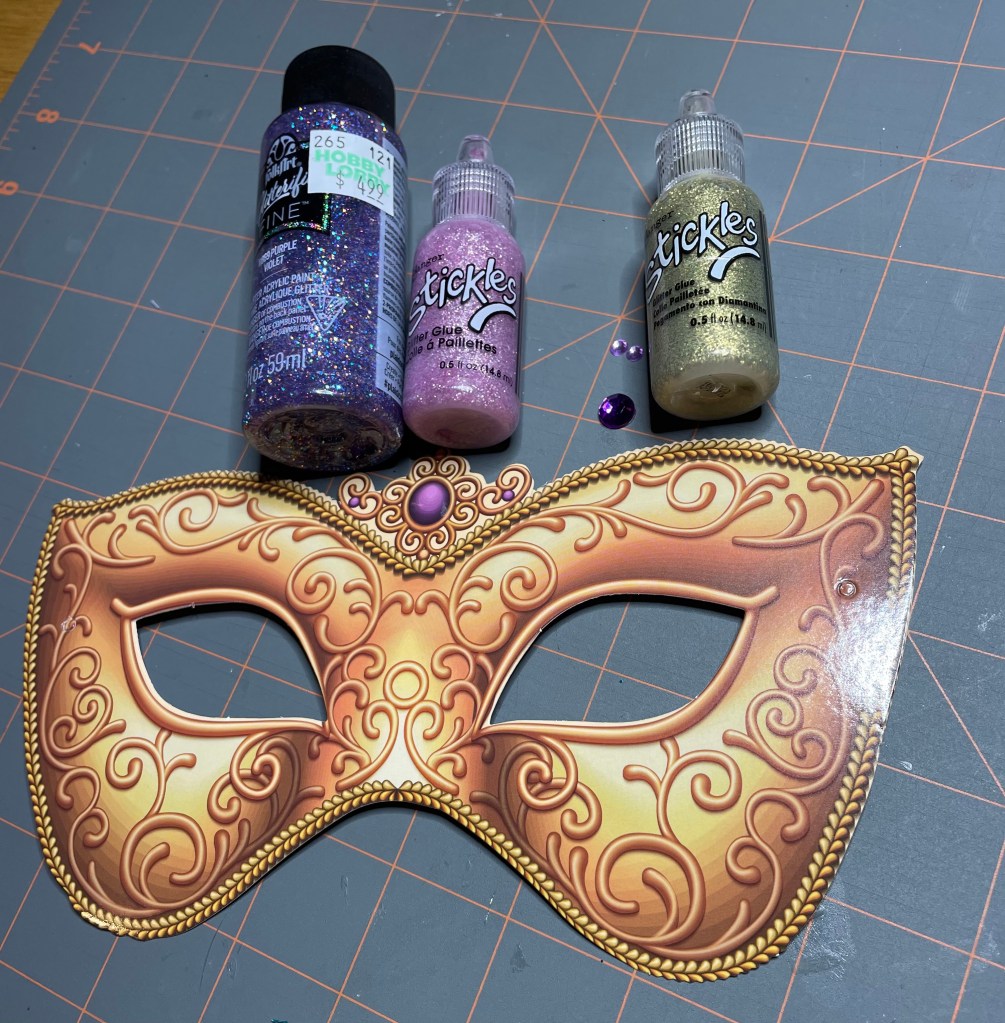 Mask #2. Not changes to the selections of item I pulled for this mask. Purple Glitterific was used along the outer edge of the mask, the gold Stickles was used around the eyes, and the other Stickles was used to accent the filigree above the eyes only. Rhinestones were glued in place at the top of the mask using Nuvo Deluxe Adhesive.