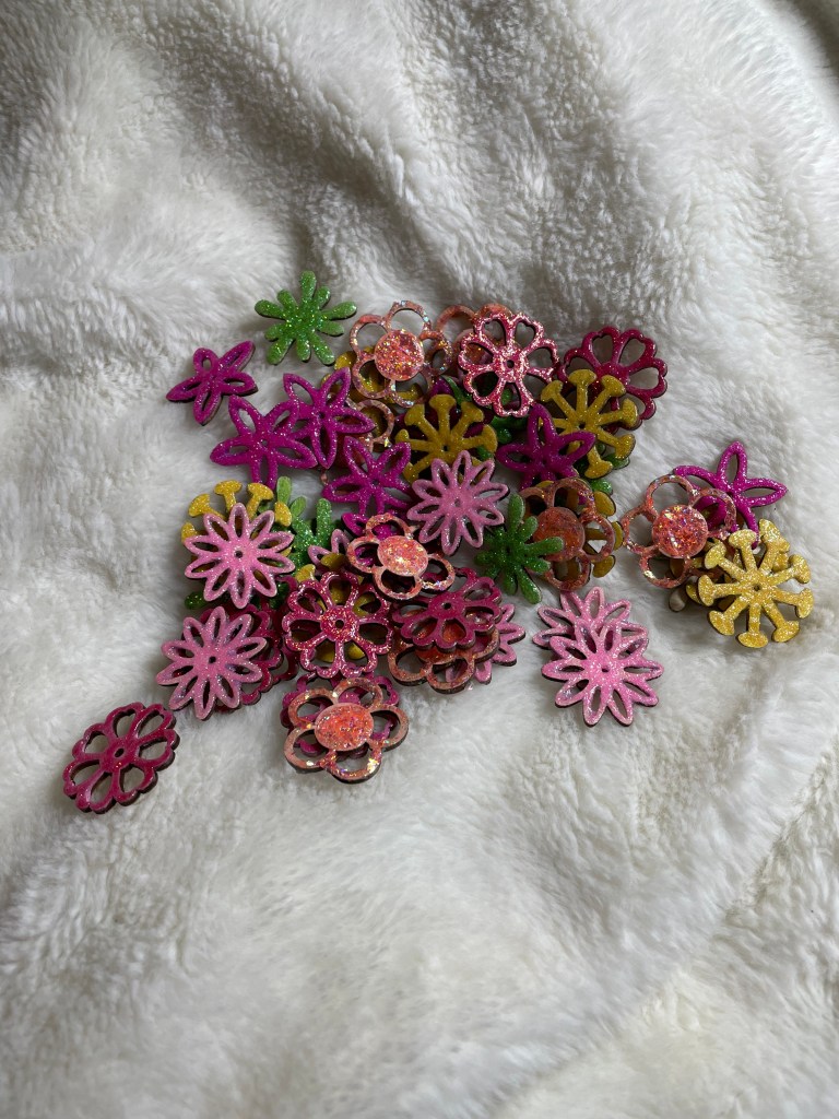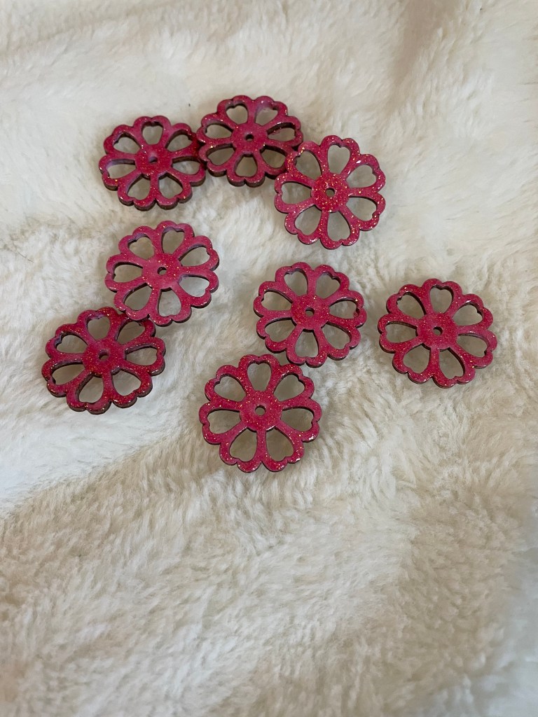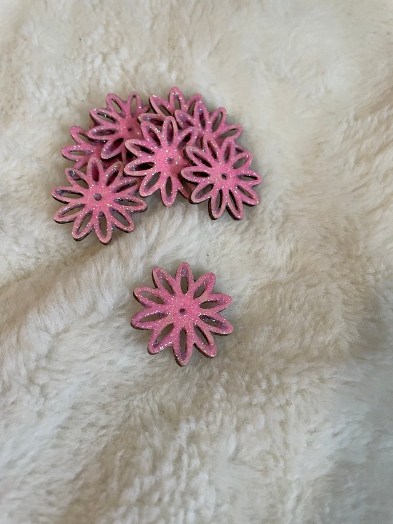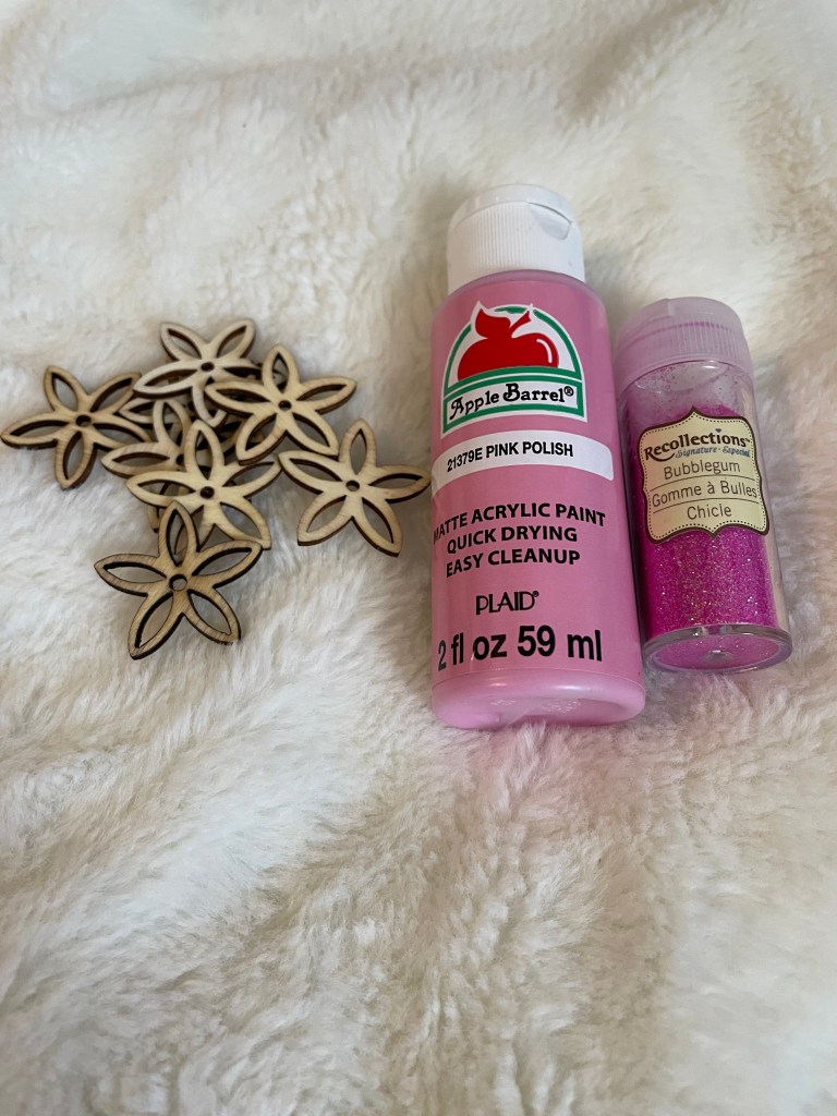 Flower number one was created using Apple Barrel matte acrylic paint in pink polish as a base coat. I then topped the base coat with 2 coats of FolkArt multi-surface glitter acrylic paint. I love how the flower has turned out. I have high hopes for the remainder flowers.