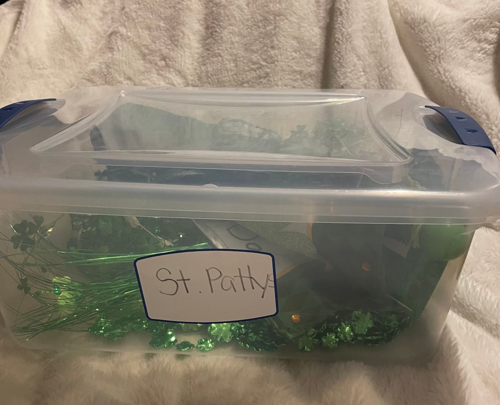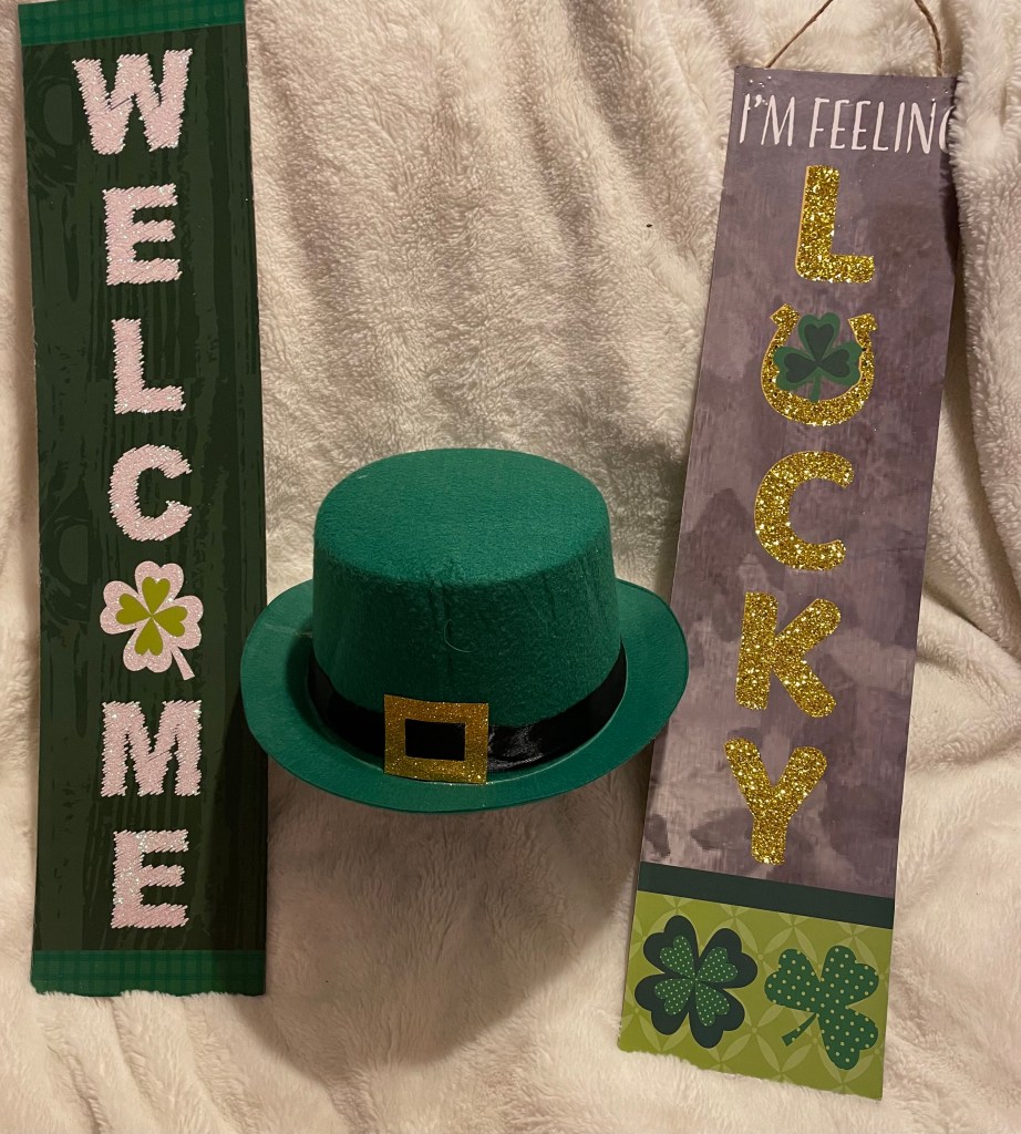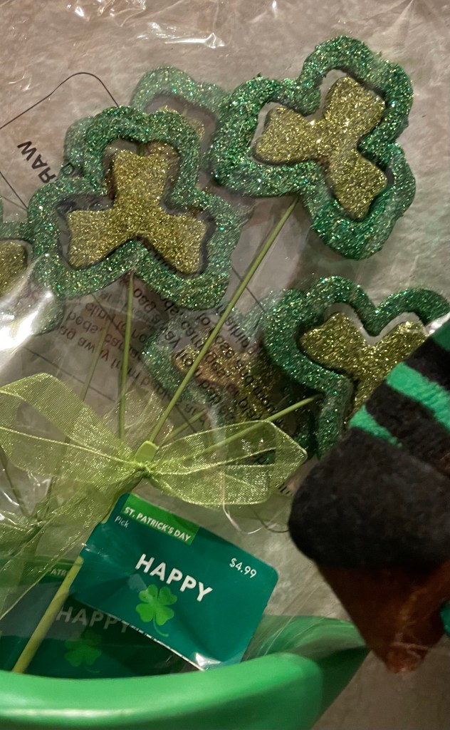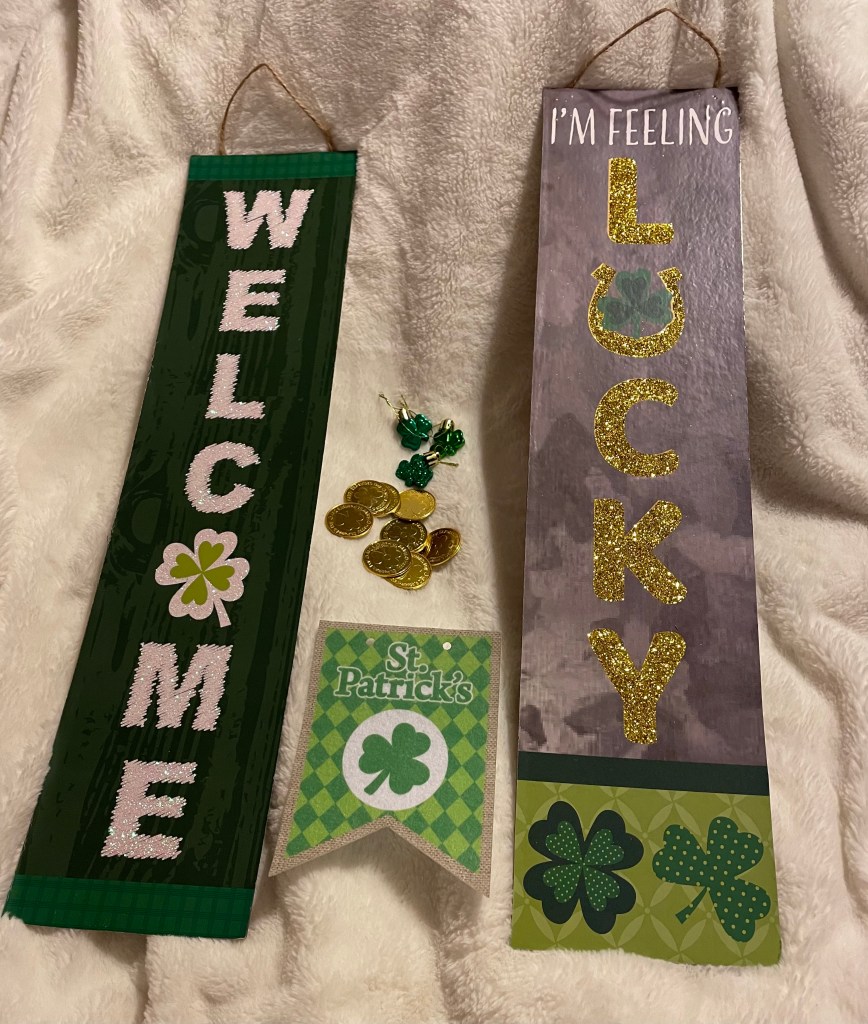 Amazon always has what I need to really make her door stand out! This time, I purchased a St. Patrick’s Day themed banner, some clover shaped garland, gold coins, and clover shaped ornaments. The banner and garland will go around her front door, the clover ornaments will be placed on the tree, and some of the gold ornaments will be used for a craft project or two and the remaining will be put around the frog and in the green boot.