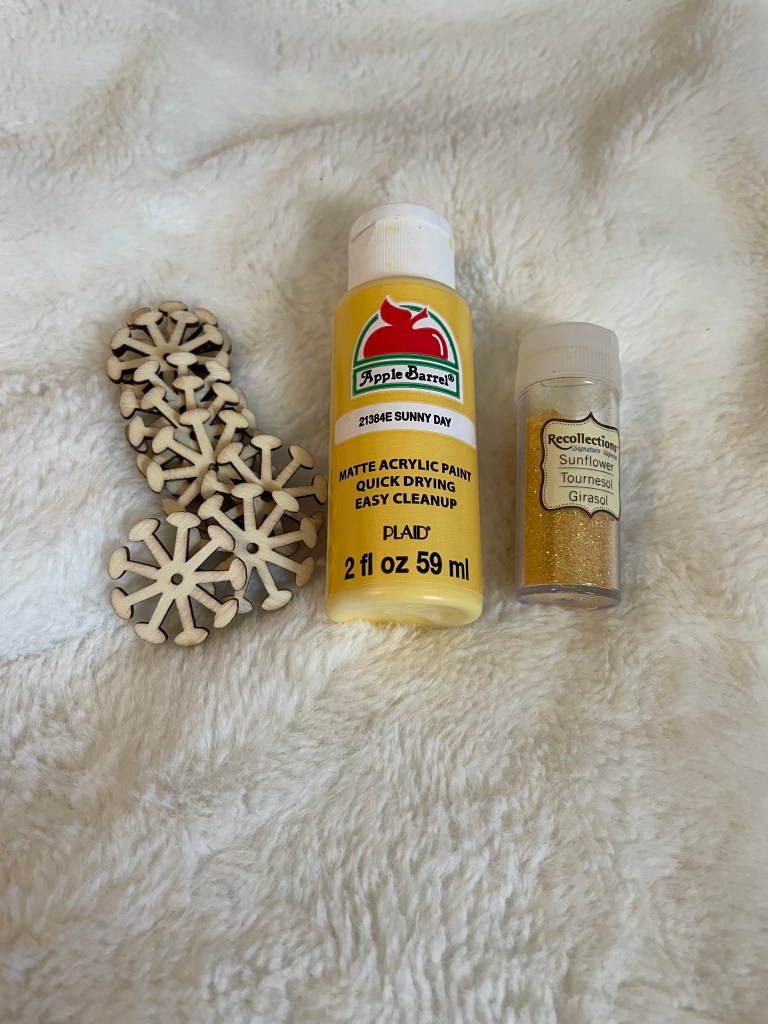 Flower number four was created using Apple Barrel matte acrylic paint in the color Sunny Day as the base coat and topping it with Recollections fine glitter in the color Sunflower.