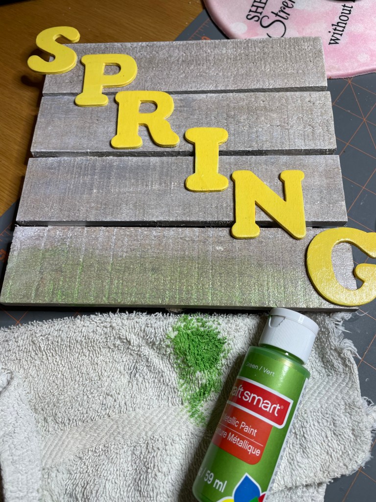 Before I attached the ribbon, flowers, and butterflies, I decided to rub some green metallic paint to the bottom slat of the frame.