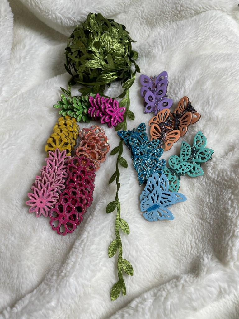 I then got all of the wood flowers and butterflies I had painted together. As a very last minute purchased, I found some green leaf ribbon on Amazon that I thought would work perfect to add vines and a little more character to the frame.