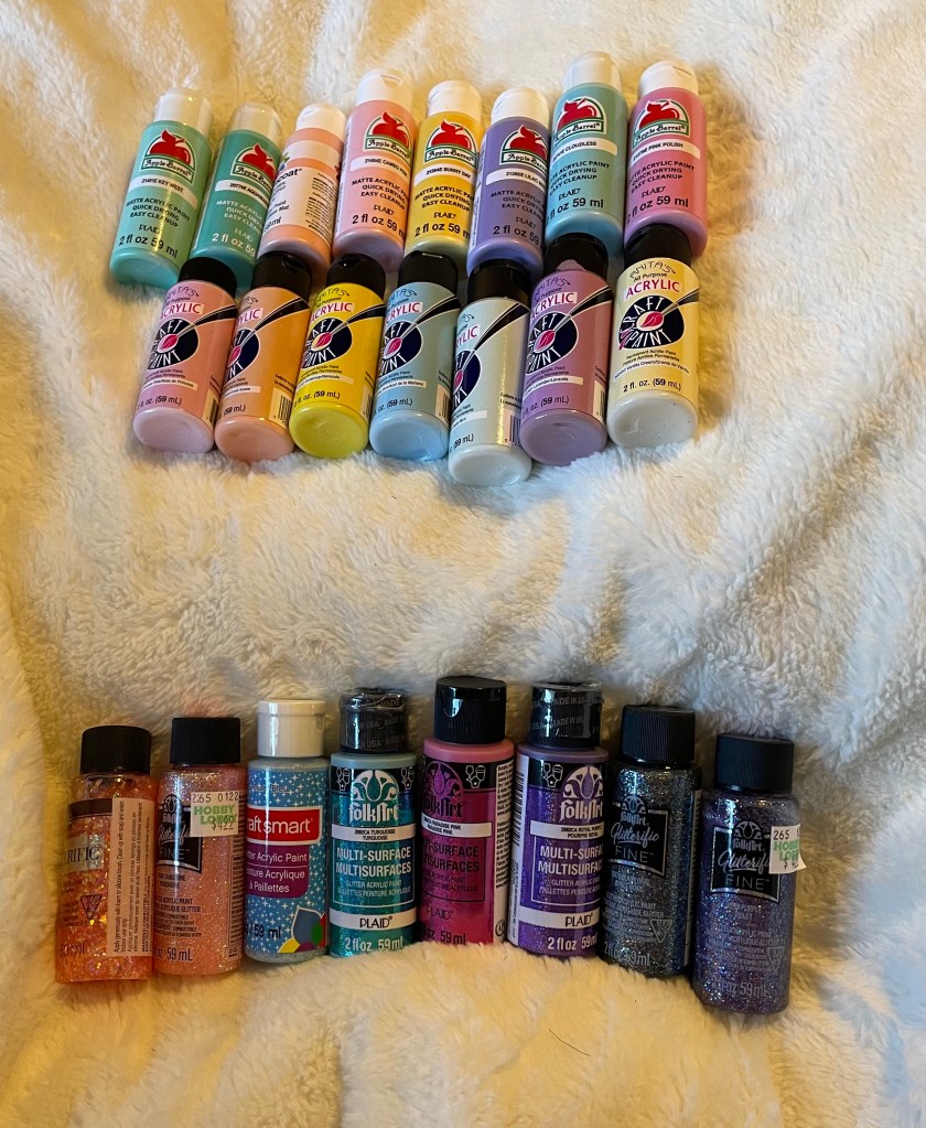 I purchased a lot of acrylic paints for the spring projects. Some came from Hobby Lobby, some from Michaels, and some from Walmart.