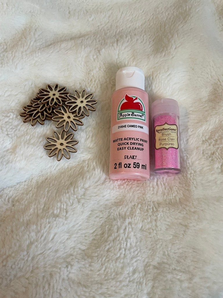 Flower number three was created using Apple Barrel matte acrylic paint in the color Cameo Pink as the base coat and topping it with Recollections fine glitter in the color blush. I love how subtle the color turned out.