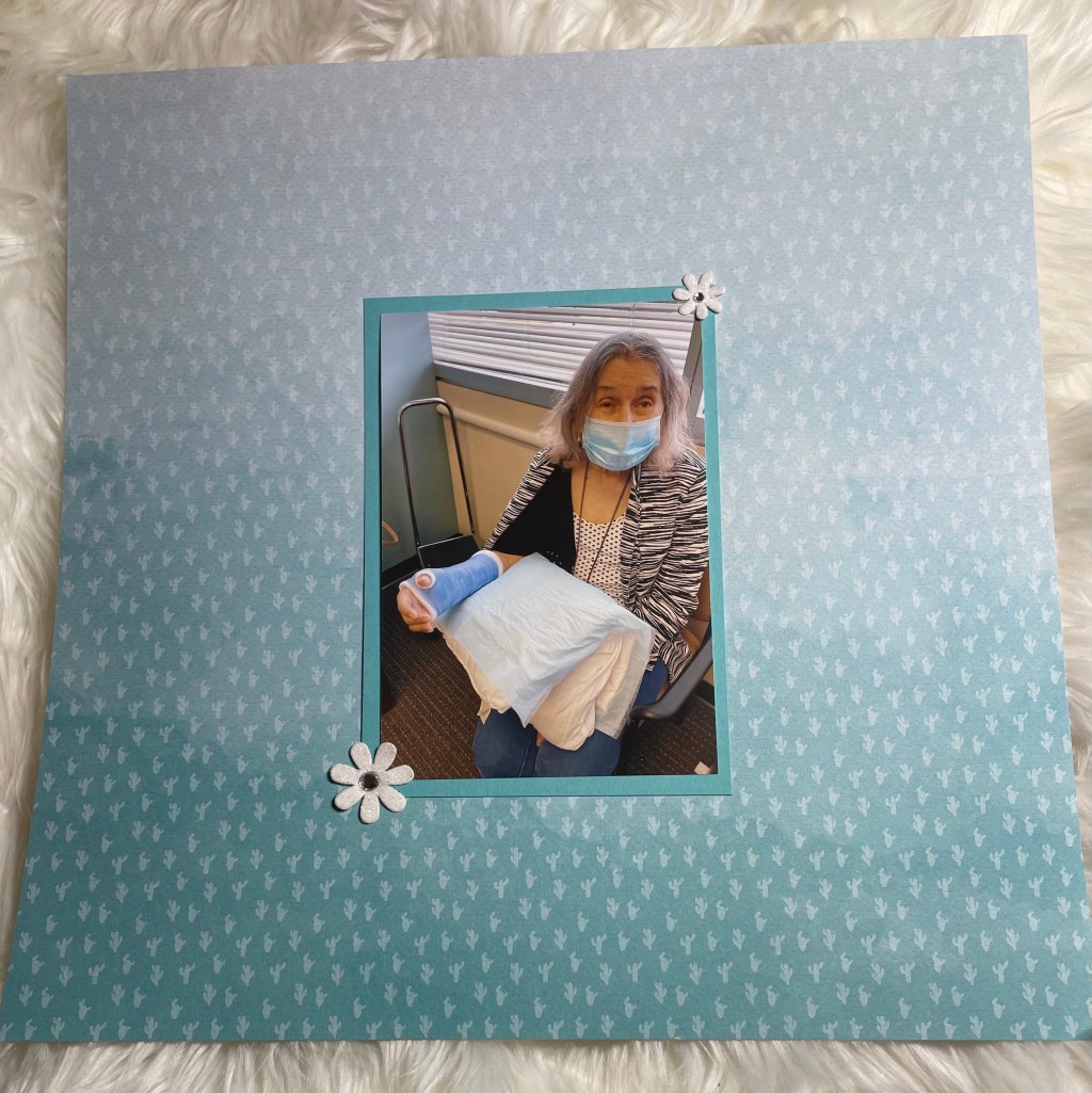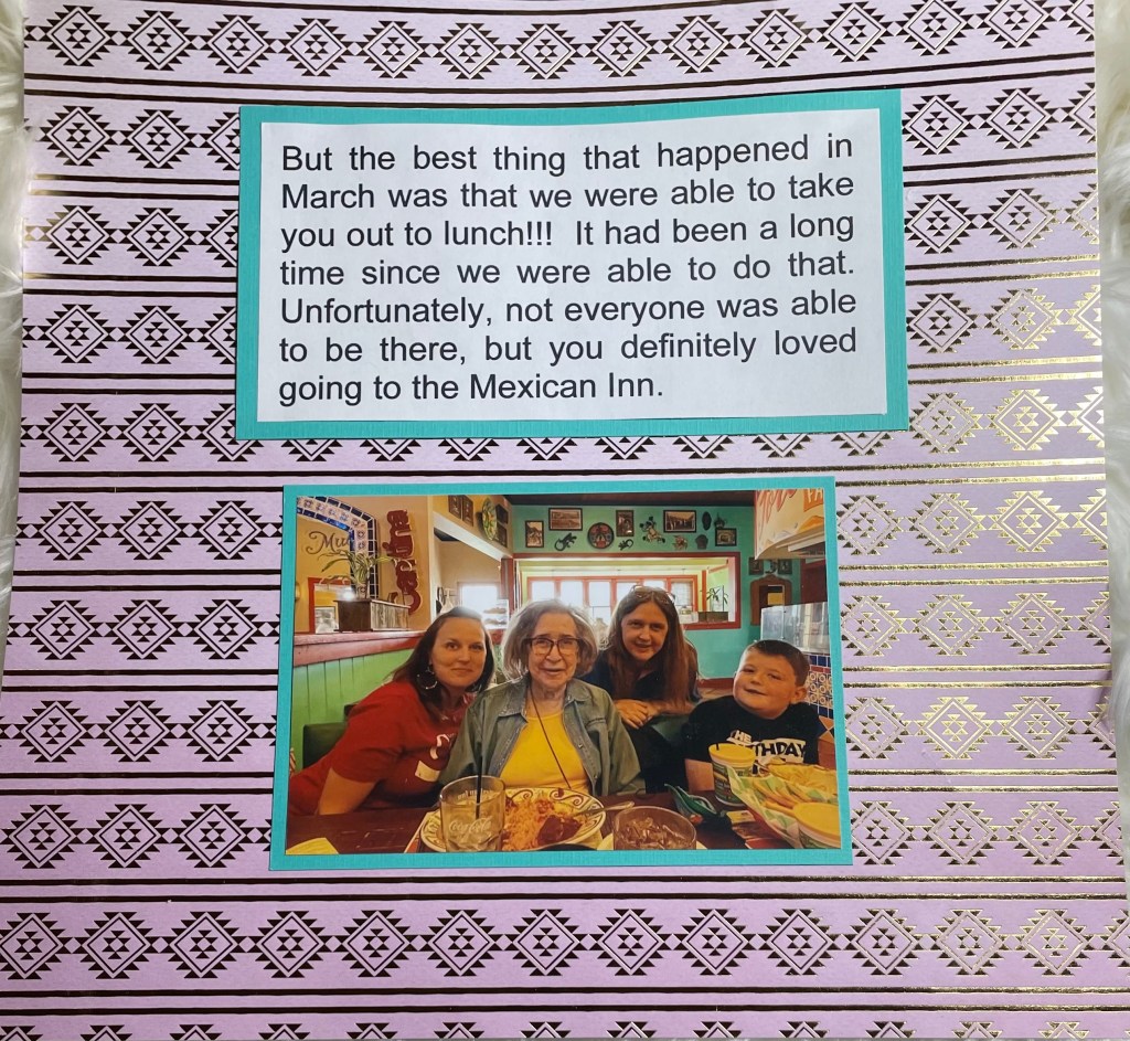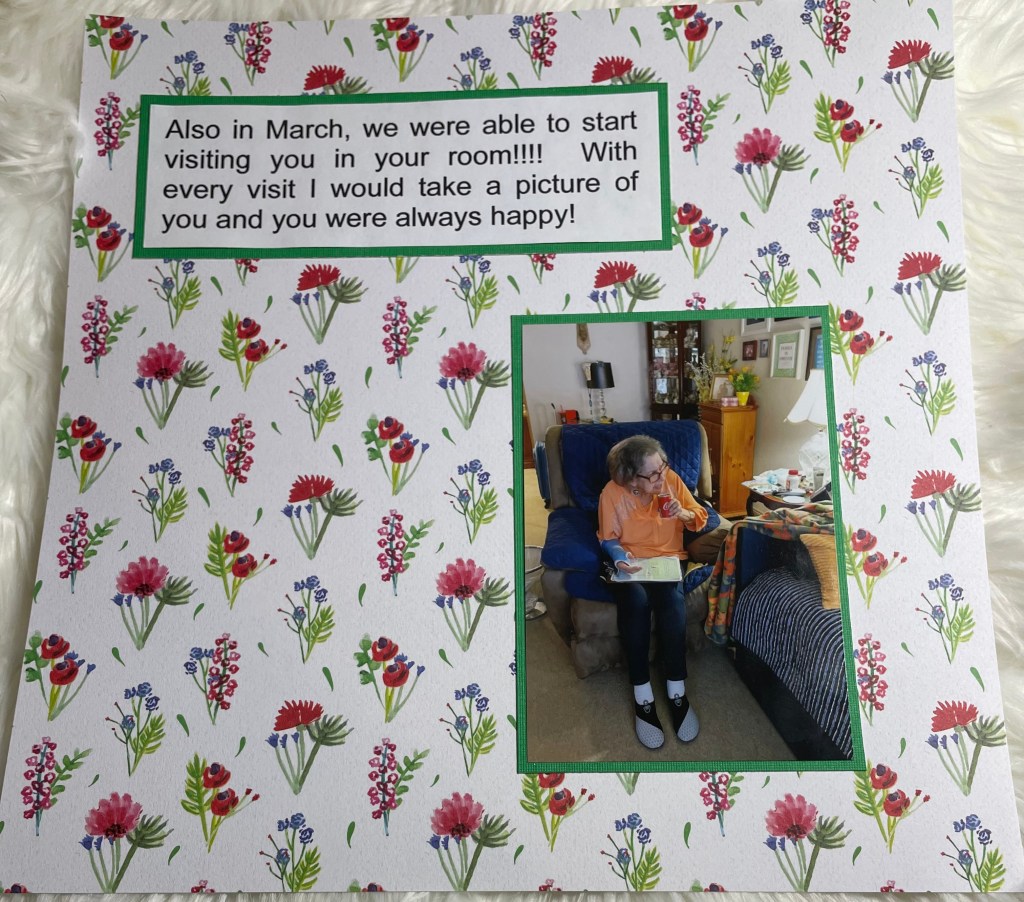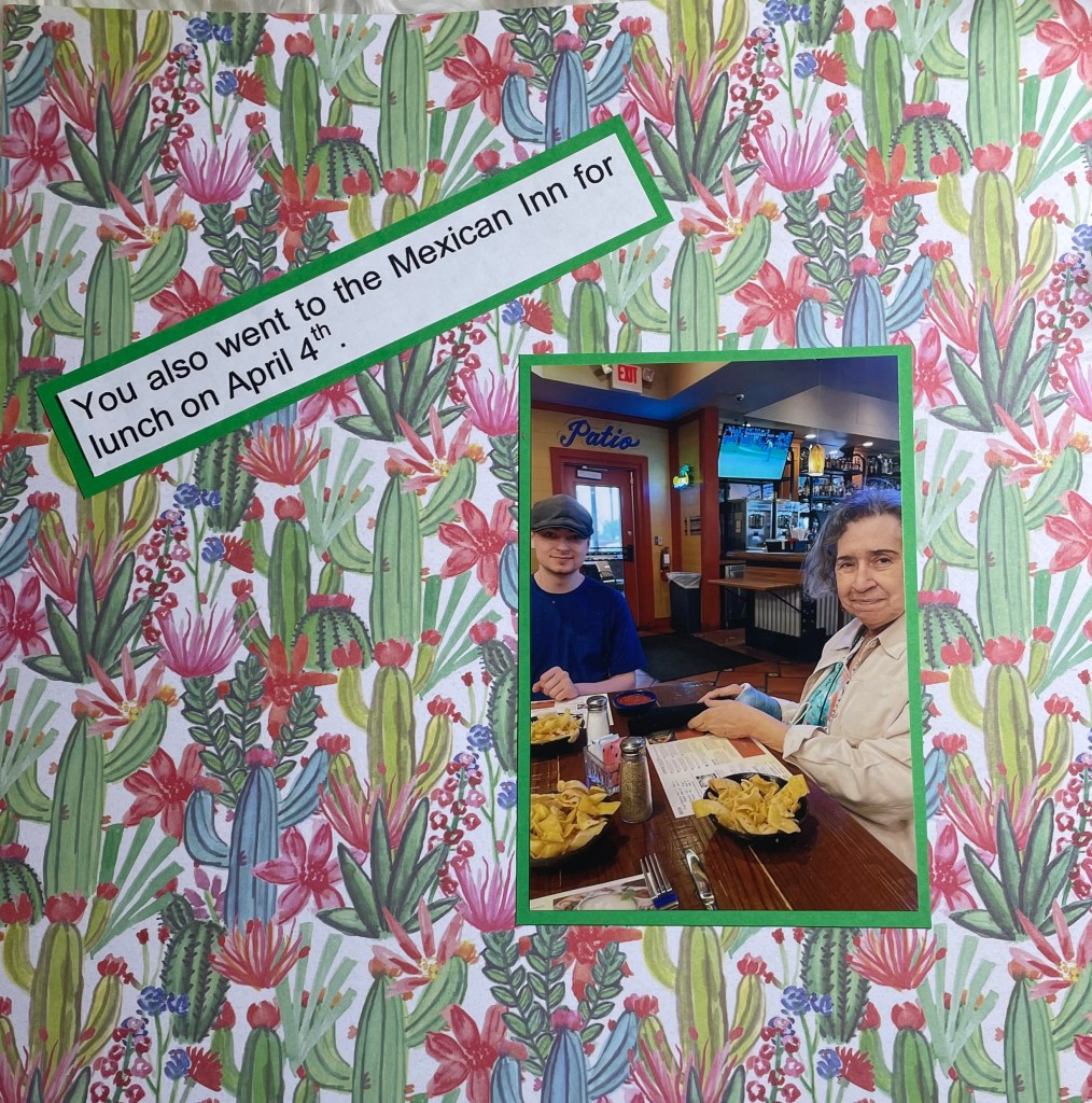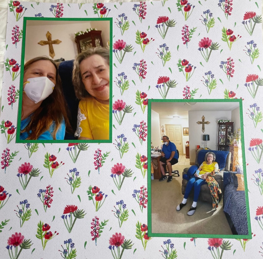 Hello and welcome back to another installment of simple scrapbook pages for my mom. As I have mentioned before, my mother resides in an assisted living facility and she has vascular dementia. I have decided to make her an scrapbook album to show her what she did when the facility was not in lockdown. I am making all the pages simple so she can better concentrate on the story, not a lot of embellishments. Although I’m sure she would like that as well.